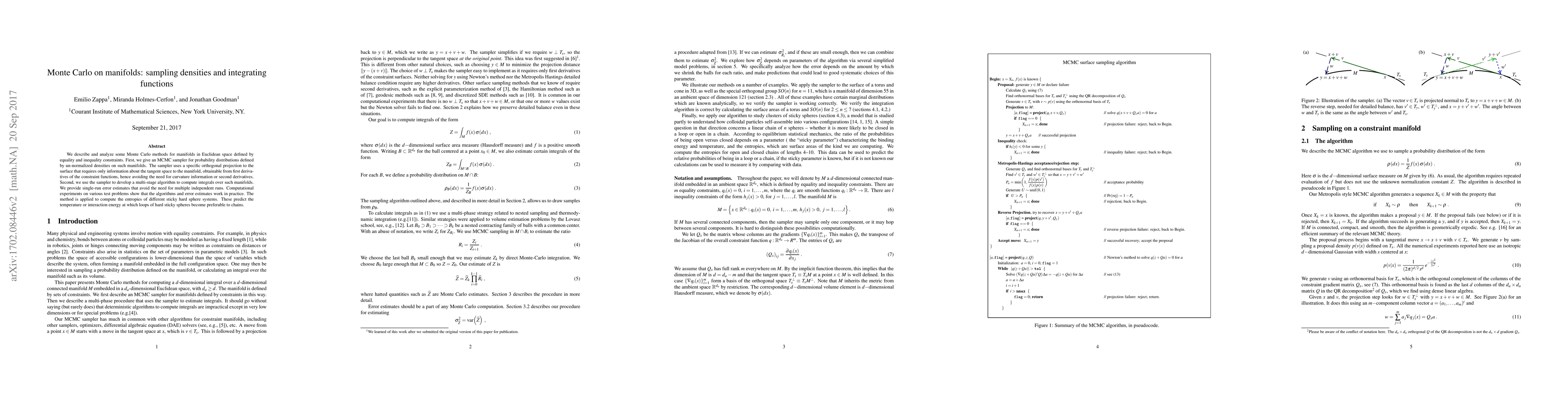 We describe and analyze some Monte Carlo methods for manifolds in Euclidean space defined by equality and inequality constraints. First, we give an MCMC sampler for probability distributions defined by un-normalized densities on such manifolds. The sampler uses a specific orthogonal projection to the surface that requires only information about the tangent space to the manifold, obtainable from first derivatives of the constraint functions, hence avoiding the need for curvature information or second derivatives. Second, we use the sampler to develop a multi-stage algorithm to compute integrals over such manifolds. We provide single-run error estimates that avoid the need for multiple independent runs. Computational experiments on various test problems show that the algorithms and error estimates work in practice. The method is applied to compute the entropies of different sticky hard sphere systems. These predict the temperature or interaction energy at which loops of hard sticky spheres become preferable to chains.