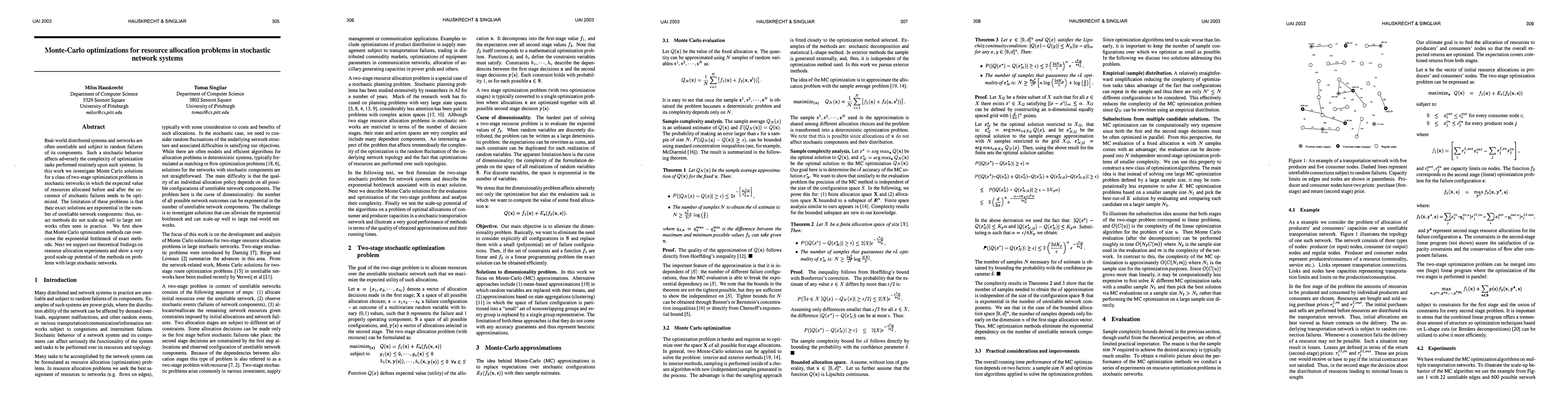 This paper develops Monte Carlo optimization methods to solve resource allocation problems in stochastic network systems, addressing the exponential complexity of exact solutions. The authors demonstrate that these methods effectively scale to large networks, supported by experimental results showing good performance.