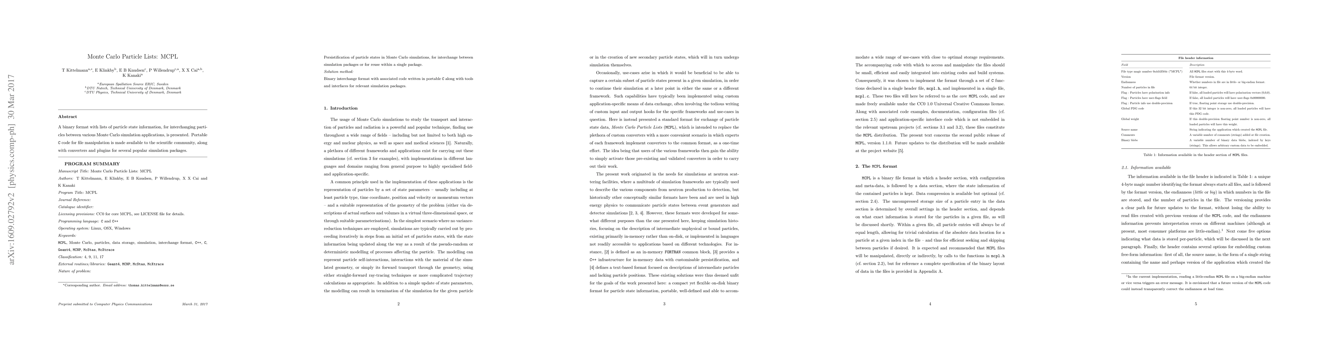 This paper introduces Monte Carlo Particle Lists (MCPL), a binary format for sharing particle data across different Monte Carlo simulation applications. It provides portable C code and converters for various simulation packages, facilitating interoperability and data exchange in scientific computing.