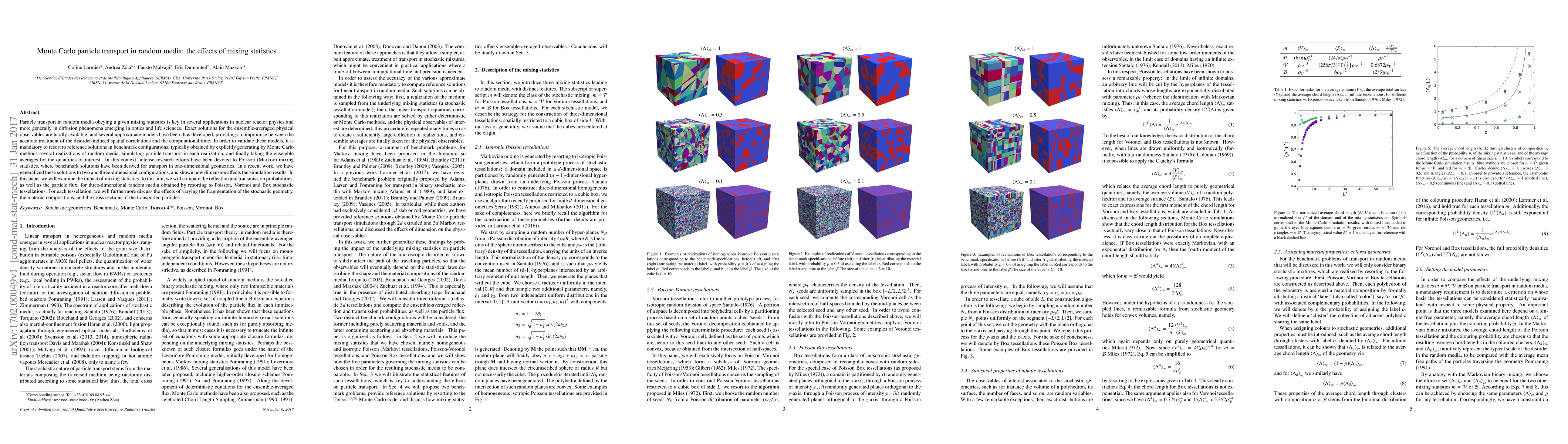 Particle transport in random media obeying a given mixing statistics is key in several applications in nuclear reactor physics and more generally in diffusion phenomena emerging in optics and life sciences. Exact solutions for the ensemble-averaged physical observables are hardly available, and several approximate models have been thus developed, providing a compromise between the accurate treatment of the disorder-induced spatial correlations and the computational time. In order to validate these models, it is mandatory to resort to reference solutions in benchmark configurations, typically obtained by explicitly generating by Monte Carlo methods several realizations of random media, simulating particle transport in each realization, and finally taking the ensemble averages for the quantities of interest. In this context, intense research efforts have been devoted to Poisson (Markov) mixing statistics, where benchmark solutions have been derived for transport in one-dimensional geometries. In a recent work, we have generalized these solutions to two and three-dimensional configurations, and shown how dimension affects the simulation results. In this paper we will examine the impact of mixing statistics: to this aim, we will compare the reflection and transmission probabilities, as well as the particle flux, for three-dimensional random media obtained by resorting to Poisson, Voronoi and Box stochastic tessellations. For each tessellation, we will furthermore discuss the effects of varying the fragmentation of the stochastic geometry, the material compositions, and the cross sections of the transported particles.