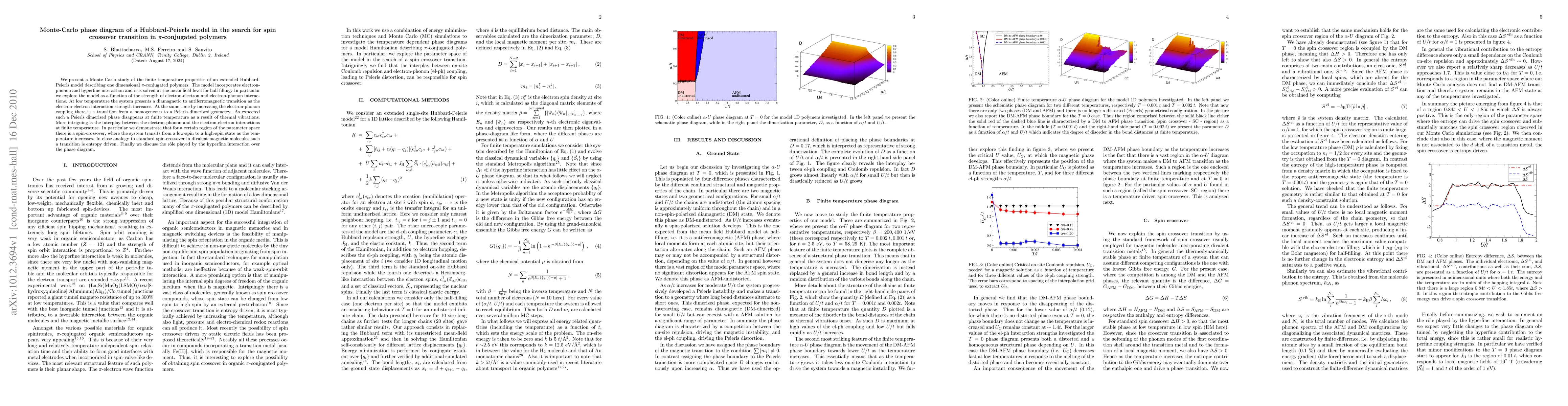We present a Monte Carlo study of the finite temperature properties of an extended Hubbard-Peierls model describing one dimensional $\pi$-conjugated polymers. The model incorporates electron-phonon and hyperfine interaction and it is solved at the mean field level for half filling. In particular we explore the model as a function of the strength of electron-electron and electron-phonon interactions. At low temperature the system presents a diamagnetic to antiferromagnetic transition as the electron-electron interaction strength increases. At the same time by increasing the electron-phonon coupling there is a transition from a homogeneous to a Peierls dimerized geometry. As expected such a Peierls dimerized phase disappears at finite temperature as a result of thermal vibrations. More intriguing is the interplay between the electron-phonon and the electron-electron interactions at finite temperature. In particular we demonstrate that for a certain region of the parameter space there is a spin-crossover, where the system transits from a low-spin to a high-spin state as the temperature increases. In close analogy to standard spin-crossover in divalent magnetic molecules such a transition is entropy driven. Finally we discuss the role played by the hyperfine interaction over the phase diagram.