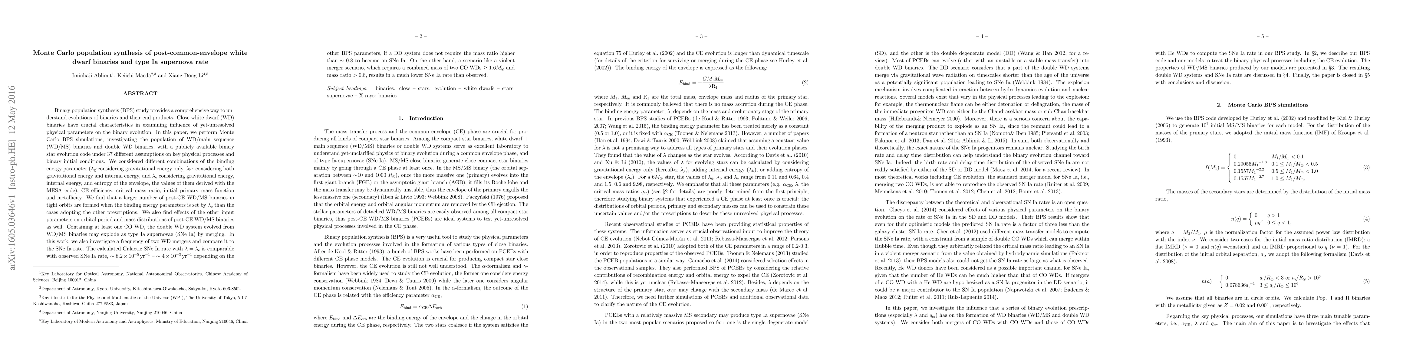 This study uses Monte Carlo simulations to investigate the formation of white dwarf binaries and their potential to explode as type Ia supernovae, with varying assumptions on physical processes and binary initial conditions.