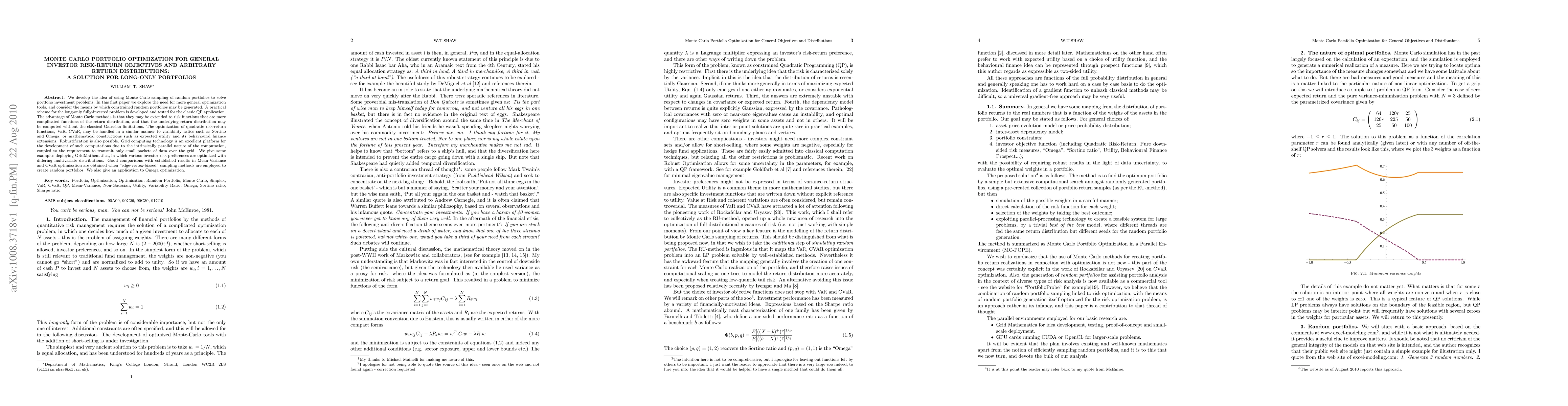 This paper introduces a Monte Carlo method for portfolio optimization, catering to diverse investor risk-return preferences and arbitrary return distributions. It outlines a practical scheme for long-only, fully-invested portfolios, demonstrating the method's applicability to complex risk functions and various distributions, surpassing classical Gaussian limitations. The approach leverages grid computing technology for efficient parallel processing, yielding favorable comparisons with traditional Mean-Variance and CVaR optimizations.