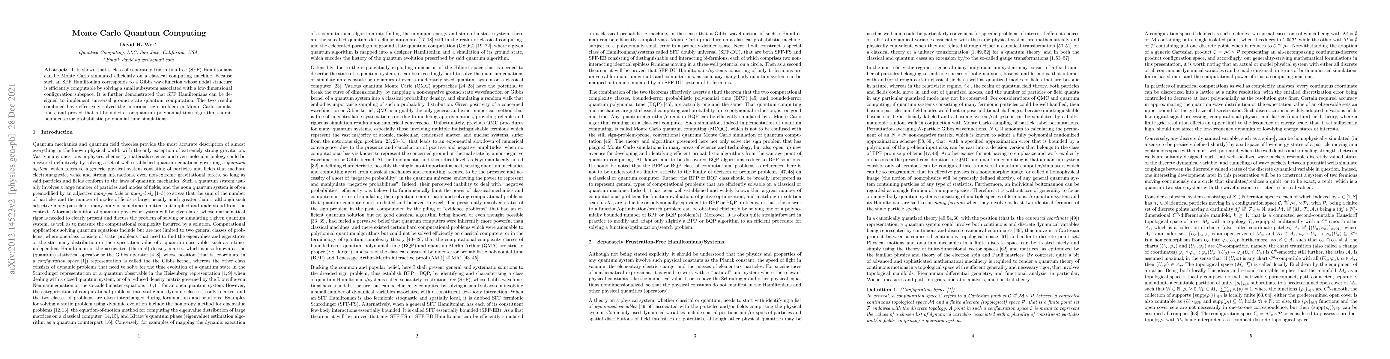 It is shown that a class of separately frustration-free (SFF) Hamiltonians can be Monte Carlo simulated efficiently on a classical computing machine, because such an SFF Hamiltonian corresponds to a Gibbs wavefunction whose nodal structure is efficiently computable by solving a small subsystem associated with a low-dimensional configuration subspace. It is further demonstrated that SFF Hamiltonians can be designed to implement universal ground state quantum computation. The two results combined have effectively solved the notorious sign problem in Monte Carlo simulations, and proved that all bounded-error quantum polynomial time algorithms admit bounded-error probabilistic polynomial time simulations.