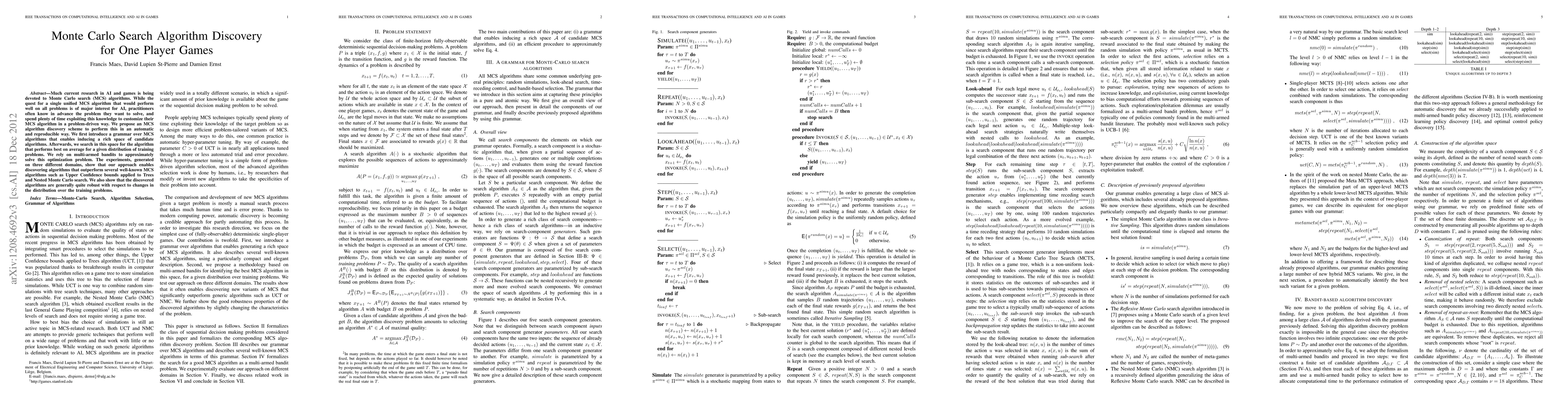 Much current research in AI and games is being devoted to Monte Carlo search (MCS) algorithms. While the quest for a single unified MCS algorithm that would perform well on all problems is of major interest for AI, practitioners often know in advance the problem they want to solve, and spend plenty of time exploiting this knowledge to customize their MCS algorithm in a problem-driven way. We propose an MCS algorithm discovery scheme to perform this in an automatic and reproducible way. We first introduce a grammar over MCS algorithms that enables inducing a rich space of candidate algorithms. Afterwards, we search in this space for the algorithm that performs best on average for a given distribution of training problems. We rely on multi-armed bandits to approximately solve this optimization problem. The experiments, generated on three different domains, show that our approach enables discovering algorithms that outperform several well-known MCS algorithms such as Upper Confidence bounds applied to Trees and Nested Monte Carlo search. We also show that the discovered algorithms are generally quite robust with respect to changes in the distribution over the training problems.