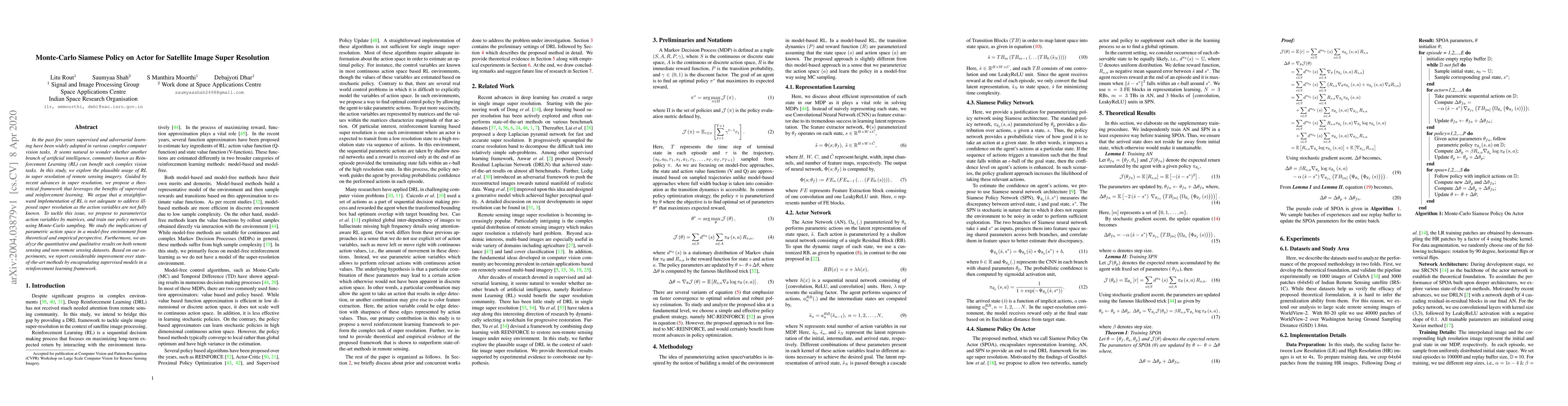 In the past few years supervised and adversarial learning have been widely adopted in various complex computer vision tasks. It seems natural to wonder whether another branch of artificial intelligence, commonly known as Reinforcement Learning (RL) can benefit such complex vision tasks. In this study, we explore the plausible usage of RL in super resolution of remote sensing imagery. Guided by recent advances in super resolution, we propose a theoretical framework that leverages the benefits of supervised and reinforcement learning. We argue that a straightforward implementation of RL is not adequate to address ill-posed super resolution as the action variables are not fully known. To tackle this issue, we propose to parameterize action variables by matrices, and train our policy network using Monte-Carlo sampling. We study the implications of parametric action space in a model-free environment from theoretical and empirical perspective. Furthermore, we analyze the quantitative and qualitative results on both remote sensing and non-remote sensing datasets. Based on our experiments, we report considerable improvement over state-of-the-art methods by encapsulating supervised models in a reinforcement learning framework.