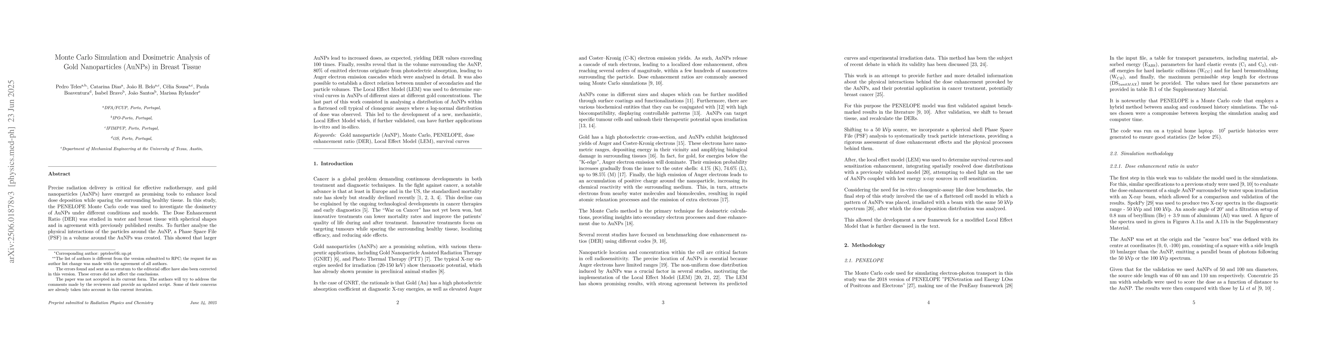 The research employed the PENELOPE Monte Carlo code to simulate the dosimetry of gold nanoparticles (AuNPs) in breast tissue, analyzing Dose Enhancement Ratio (DER) and electron emission cascades through Phase Space File (PSF) creation.