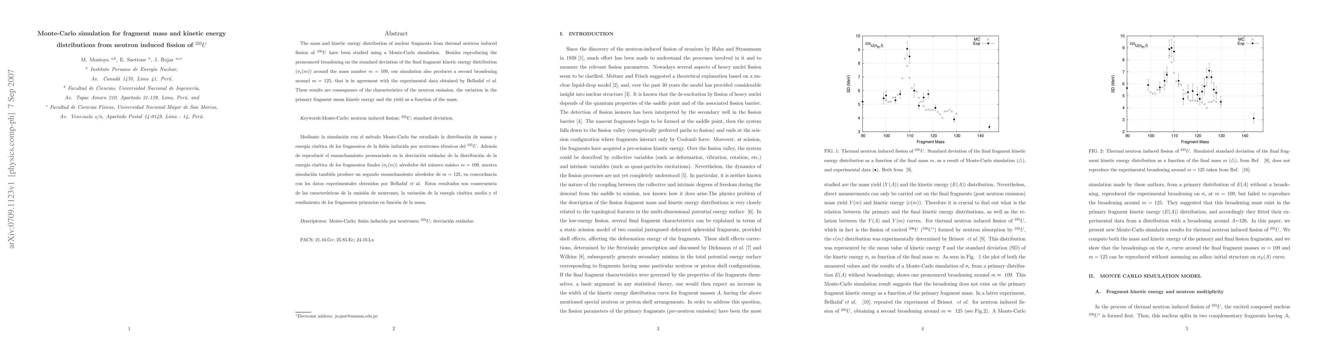 This paper uses Monte-Carlo simulations to study the mass and kinetic energy distributions of fragments from thermal neutron-induced fission of 235U, revealing two broadening regions in the kinetic energy distribution that match experimental data, highlighting the influence of neutron emission and fragment properties.