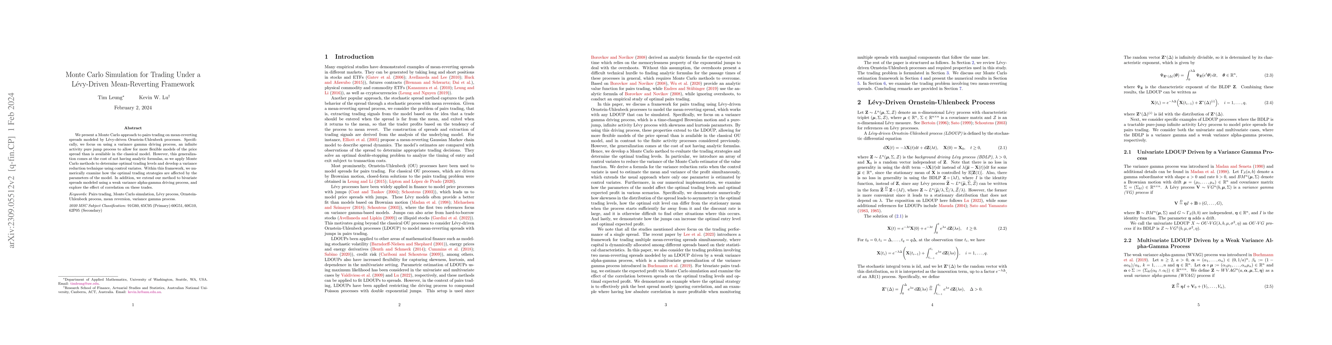 This paper employs Monte Carlo simulation to model pairs trading strategies for mean-reverting spreads driven by L\'evy processes, specifically using a variance gamma process. It develops a variance reduction technique to determine optimal trading levels and examines the impact of model parameters on trading strategies, extending the method to bivariate spreads with a weak variance alpha-gamma process.