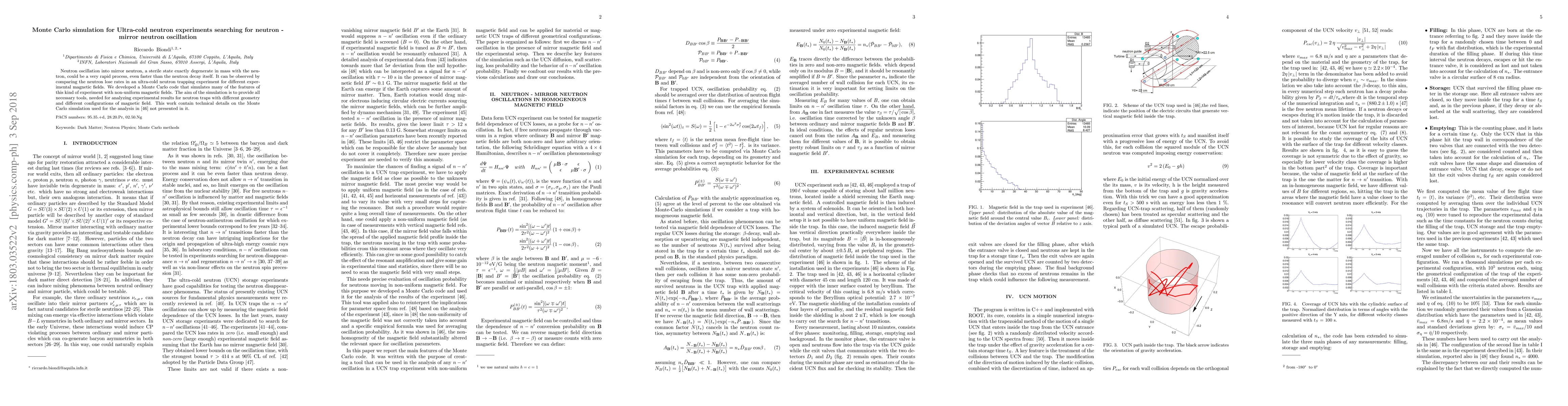 Neutron oscillation into mirror neutron, a sterile state exactly degenerate in mass with the neutron, could be a very rapid process, even faster than the neutron decay itself. It can be observed by comparing the neutron lose rates in an ultra-cold neutron trapping experiment for different experimental magnetic fields. We developed a Monte Carlo code that simulates many of the features of this kind of experiment with non-uniform magnetic fields. The aim of the simulation is to provide all necessary tools, needed for analyzing experimental results for neutron traps with different geometry and different configurations of magnetic field. This work contain technical details on the Monte Carlo simulation used for the analysis in arXiv:1712.05761 not presented in it.