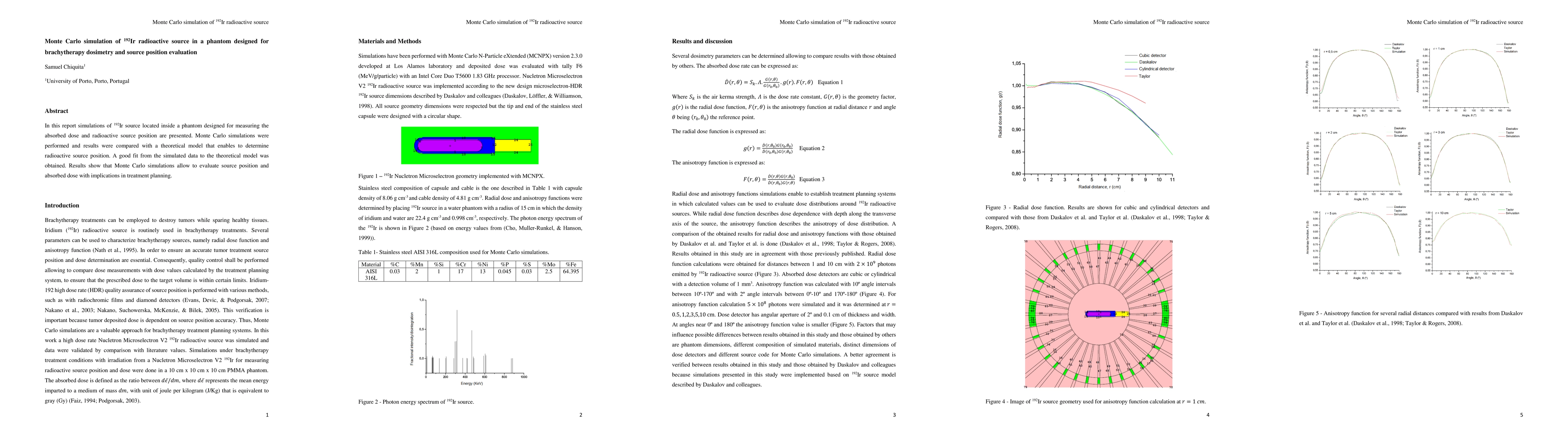 Monte Carlo simulations of a 192Ir radioactive source within a brachytherapy phantom were conducted to evaluate source position and absorbed dose. The results closely matched a theoretical model, demonstrating the utility of Monte Carlo methods in treatment planning.