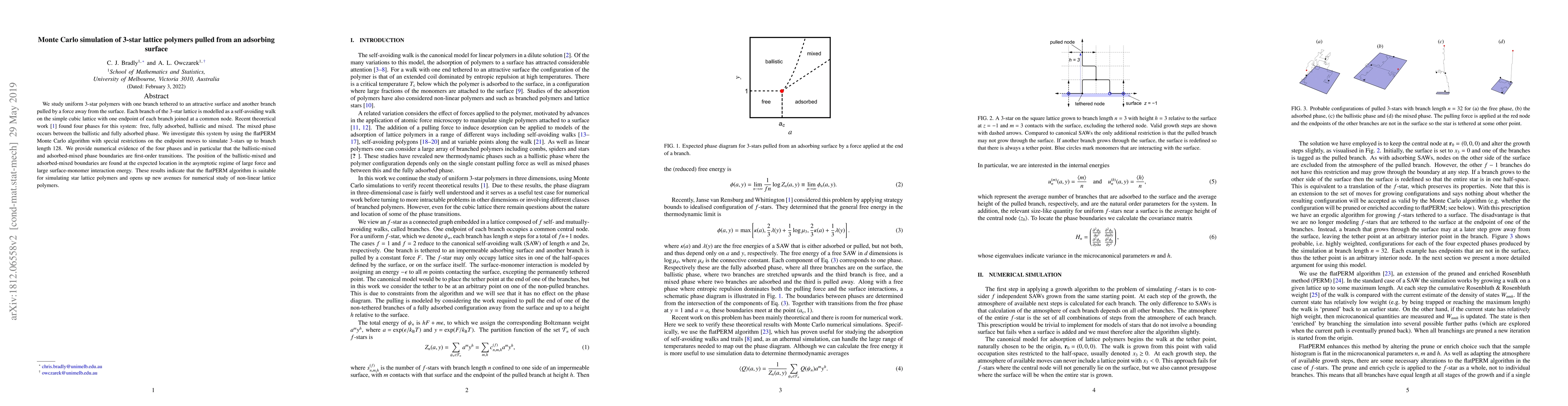 We study uniform 3-star polymers with one branch tethered to an attractive surface and another branch pulled by a force away from the surface. Each branch of the 3-star lattice is modelled as a self-avoiding walk on the simple cubic lattice with one endpoint of each branch joined at a common node. Recent theoretical work (Ref.~1) found four phases for this system: free, fully adsorbed, ballistic and mixed. The mixed phase occurs between the ballistic and fully adsorbed phase. We investigate this system by using the flatPERM Monte Carlo algorithm with special restrictions on the endpoint moves to simulate 3-stars up to branch length 128. We provide numerical evidence of the four phases and in particular that the ballistic-mixed and adsorbed-mixed phase boundaries are first-order transitions. The position of the ballistic-mixed and adsorbed-mixed boundaries are found at the expected location in the asymptotic regime of large force and large surface-monomer interaction energy. These results indicate that the flatPERM algorithm is suitable for simulating star lattice polymers and opens up new avenues for numerical study of non-linear lattice polymers.