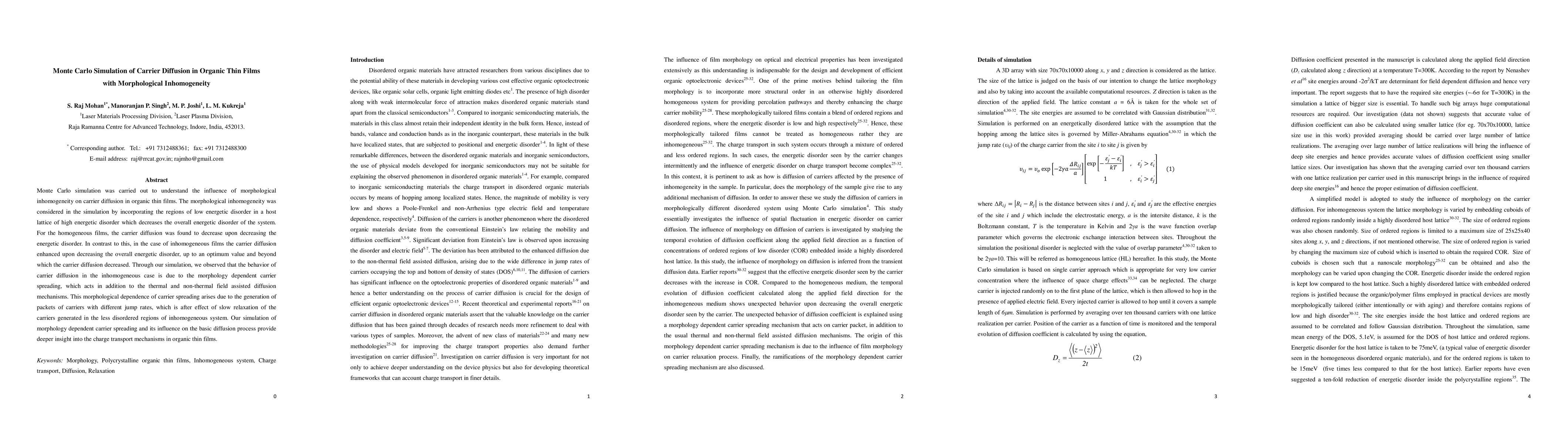 Monte Carlo simulations reveal that morphological inhomogeneity in organic thin films enhances carrier diffusion up to an optimal disorder level, due to morphology-dependent carrier spreading mechanisms. This behavior contrasts with homogeneous films, where carrier diffusion decreases with reduced energetic disorder.