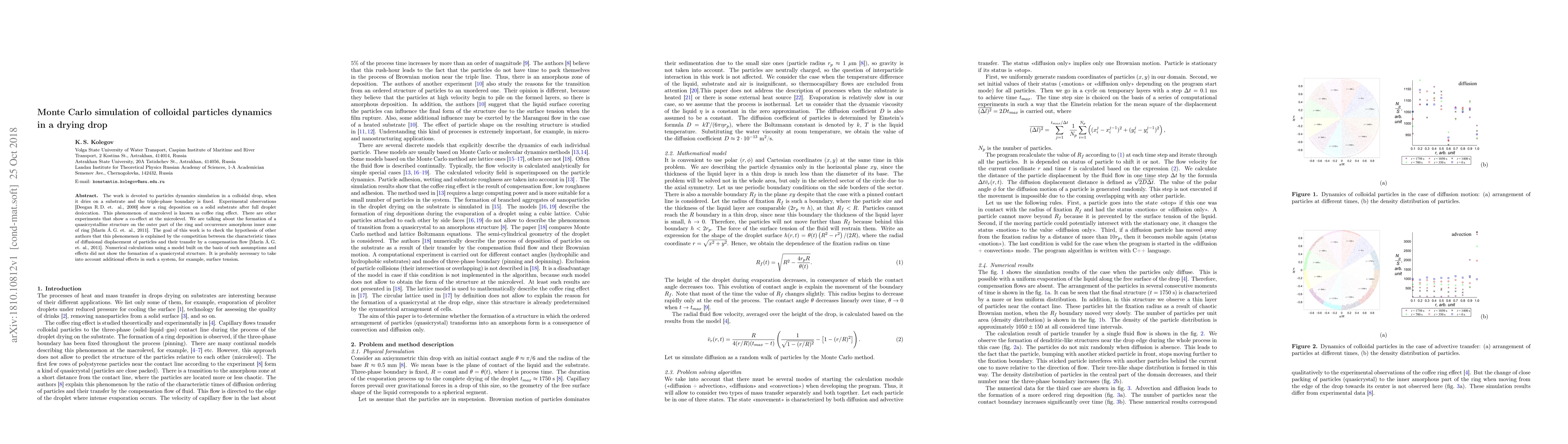 The work is devoted to particles dynamics simulation in a colloidal drop, when it dries on a substrate and the triple-phase boundary is fixed. Experimental observations [Deegan R. D. et. al., 2000] show a ring deposition on a solid substrate after full droplet desiccation. This phenomenon of macrolevel is known as coffee ring effect. There are other experiments that show a co-effect at the microlevel. We are talking about the formation of a quasicrystalline structure on the outer part of the ring and occurrence amorphous inner zone of ring [Mar\'{\i}n \'A. G. et. al., 2011]. The goal of this work is to check the hypothesis of other authors that this phenomenon is explained by the competition between the characteristic times of diffusional displacement of particles and their transfer by a compensation flow [Mar\'{\i}n \'A. G. et. al., 2011]. Numerical calculations using a model built on the basis of such assumptions and effects did not show the formation of a quasicrystal structure. It is probably necessary to take into account additional effects in such a system, for example, surface tension.