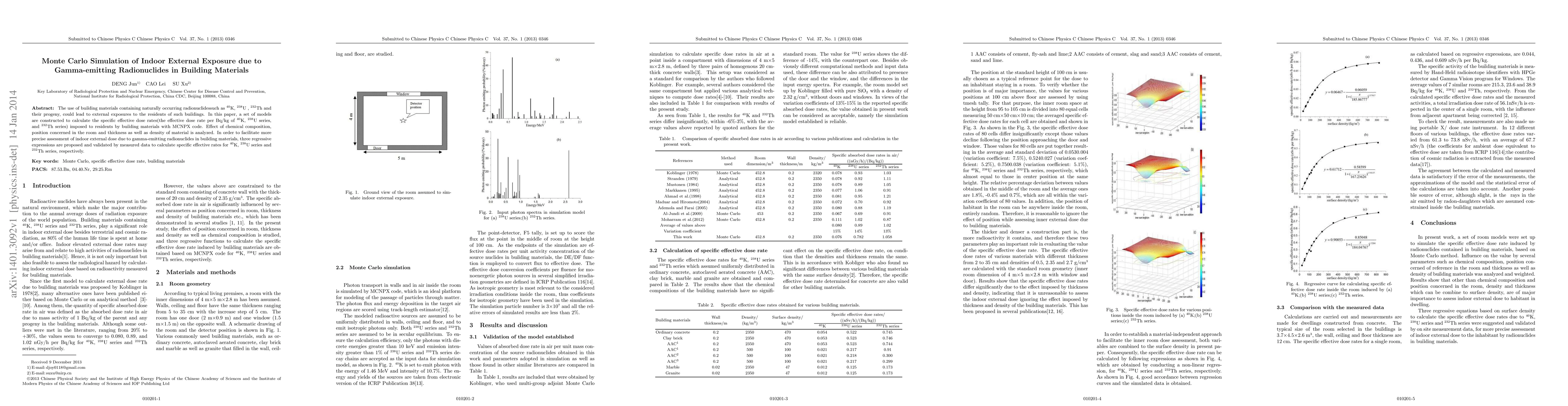 The use of building materials containing naturally occurring radionuclides,such as K-40, U-238 and Th-232 and their progeny, could lead to external exposures of the residents of such buildings. In this paper, a set of models are set up to calculate the specific effective dose rates(the effective dose rate per Bq/kg of K-40, U-238 series, and Th-232 series) imposed to residents by building materials with MCNPX code. Effect of chemical composition, position concerned in the room and thickness as well as density of material is analyzed. In order to facilitate more precise assessment of indoor external dose due to gamma emitting radionuclides in building materials, three regressive expressions are proposed and validated by measured data to calculate specific effective rate for K-40, U-238 series and Th-232 series, respectively.