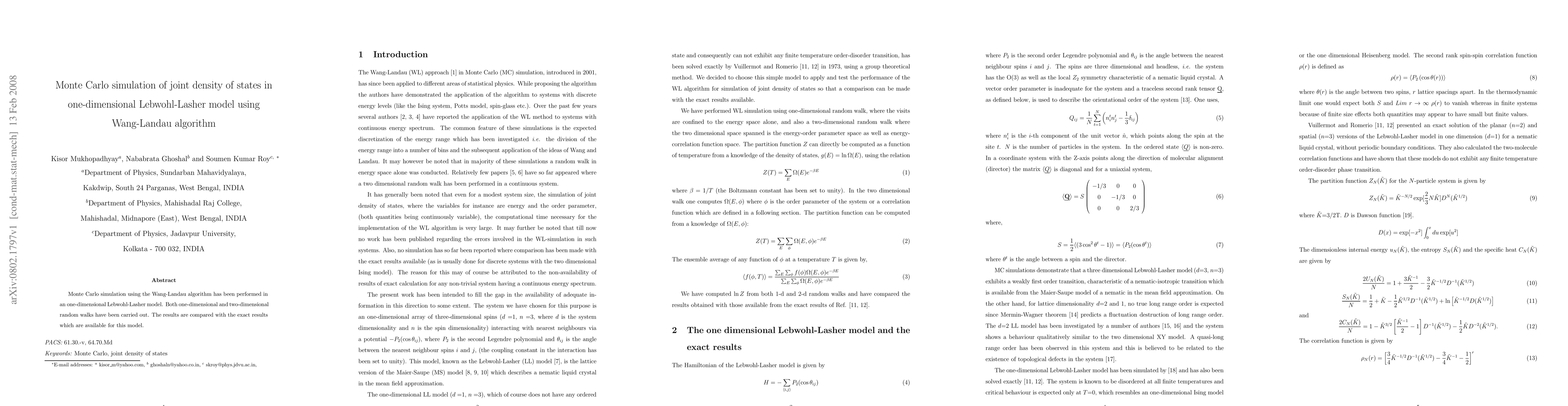 This paper employs the Wang-Landau algorithm to perform Monte Carlo simulations on the one-dimensional Lebwohl-Lasher model, comparing the obtained joint density of states with exact results available for this model. The study also explores both one-dimensional and two-dimensional random walks within the simulation.