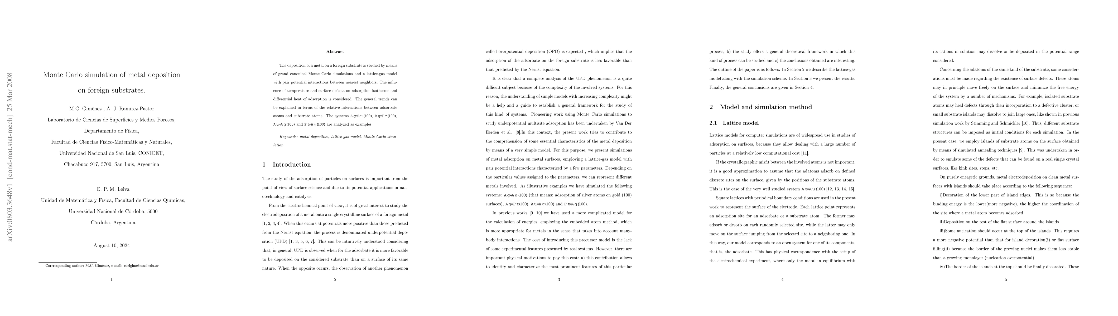 This paper uses grand canonical Monte Carlo simulations to study metal deposition on foreign substrates, focusing on the effects of temperature and surface defects on adsorption isotherms and differential heat of adsorption. The analysis of systems like Ag/Au(100) and Pt/Ag(100) reveals trends explained by interactions between adsorbate and substrate atoms.