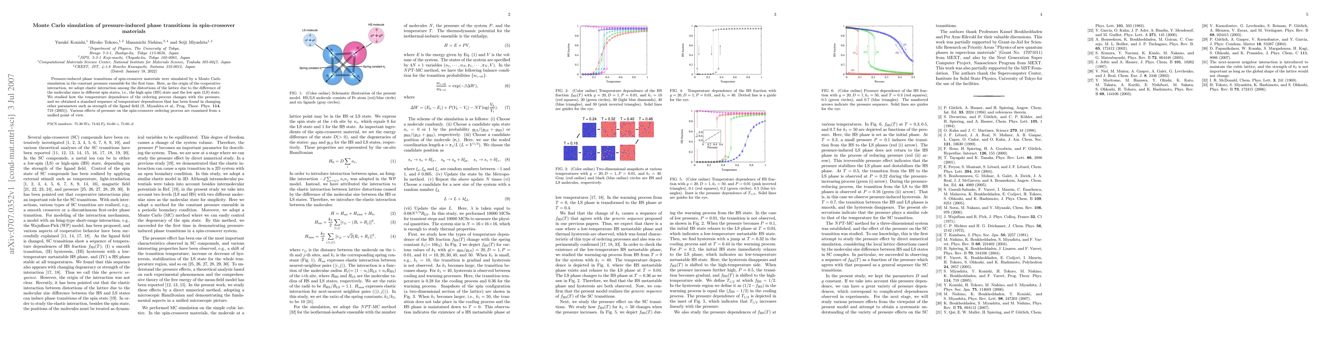 This paper uses Monte Carlo simulations to study pressure-induced phase transitions in spin-crossover materials, focusing on the elastic interactions between lattice distortions due to different molecular sizes in high and low spin states. The research reveals how pressure affects the temperature dependence of the ordering process, revealing a standard sequence similar to changes in ligand field strength.