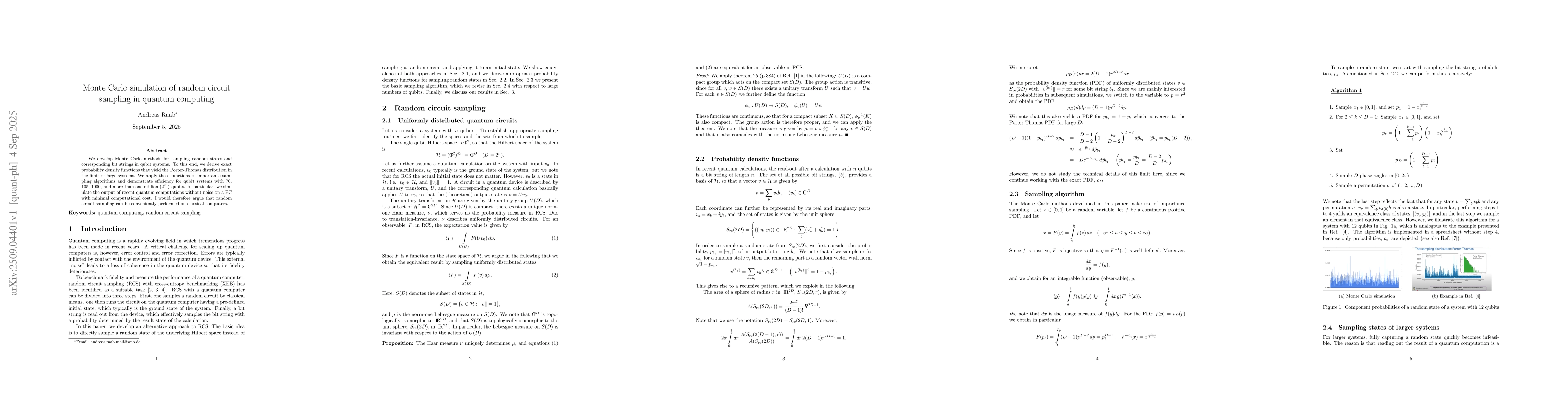 We develop Monte Carlo methods for sampling random states and corresponding bit strings in qubit systems. To this end, we derive exact probability density functions that yield the Porter-Thomas distribution in the limit of large systems. We apply these functions in importance sampling algorithms and demonstrate efficiency for qubit systems with 70, 105, 1000, and more than one million ($2^{20}$) qubits. In particular, we simulate the output of recent quantum computations without noise on a PC with minimal computational cost. I would therefore argue that random circuit sampling can be conveniently performed on classical computers.