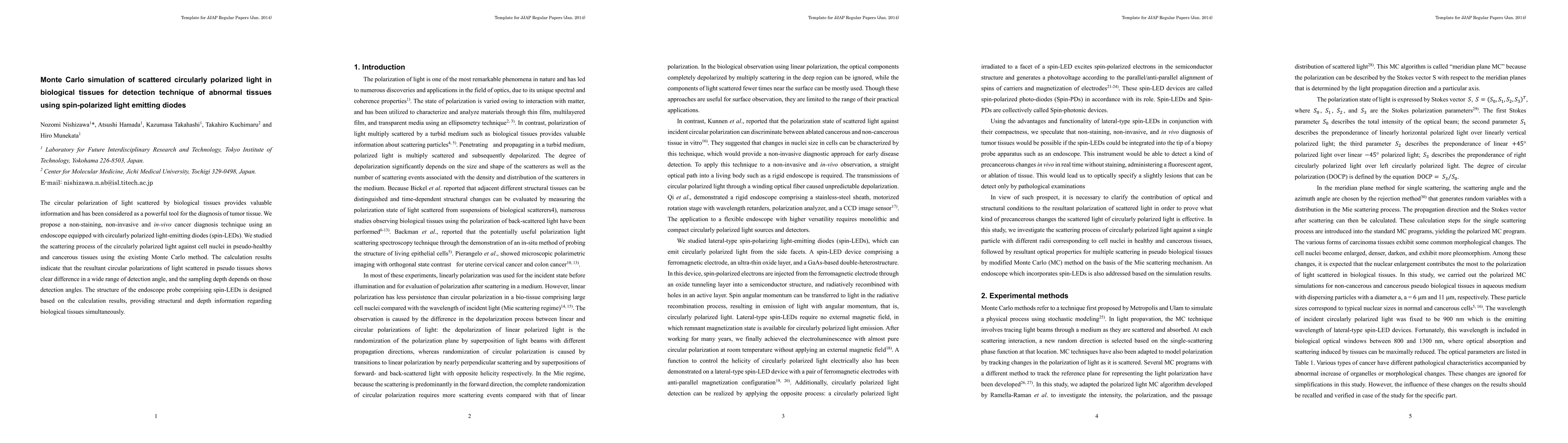 This paper proposes a non-invasive cancer diagnosis technique using spin-polarized light-emitting diodes (spin-LEDs) and Monte Carlo simulations to study scattered circularly polarized light in biological tissues. The results show distinct differences in circular polarization between pseudo-healthy and cancerous tissues, informing the design of an endoscope probe for simultaneous structural and depth tissue analysis.
