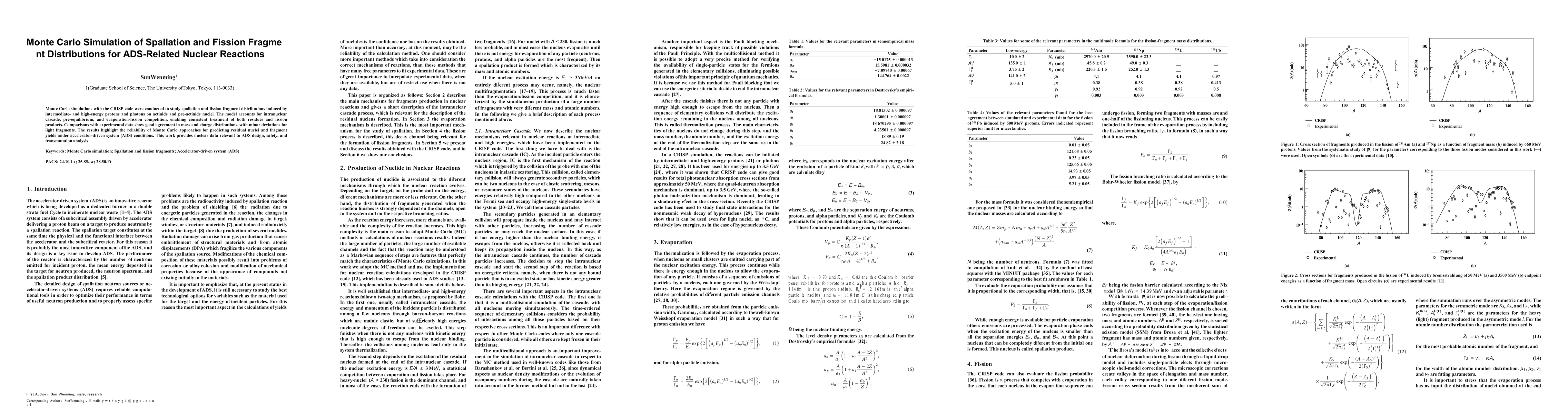 Monte Carlo simulations with the CRISP code were conducted to study spallation and fission fragment distributions induced by intermediate- and high-energy protons and photons on actinide and pre-actinide nuclei. The model accounts for intranuclear cascade, pre-equilibrium, and evaporation-fission competition, enabling consistent treatment of both residues and fission products. Comparisons with experimental data show good agreement in mass and charge distributions, with minor deviations for light fragments. The results highlight the reliability of Monte Carlo approaches for predicting residual nuclei and fragment yields under accelerator-driven system (ADS) conditions. This work provides nuclear data relevant to ADS design, safety, and transmutation analysis