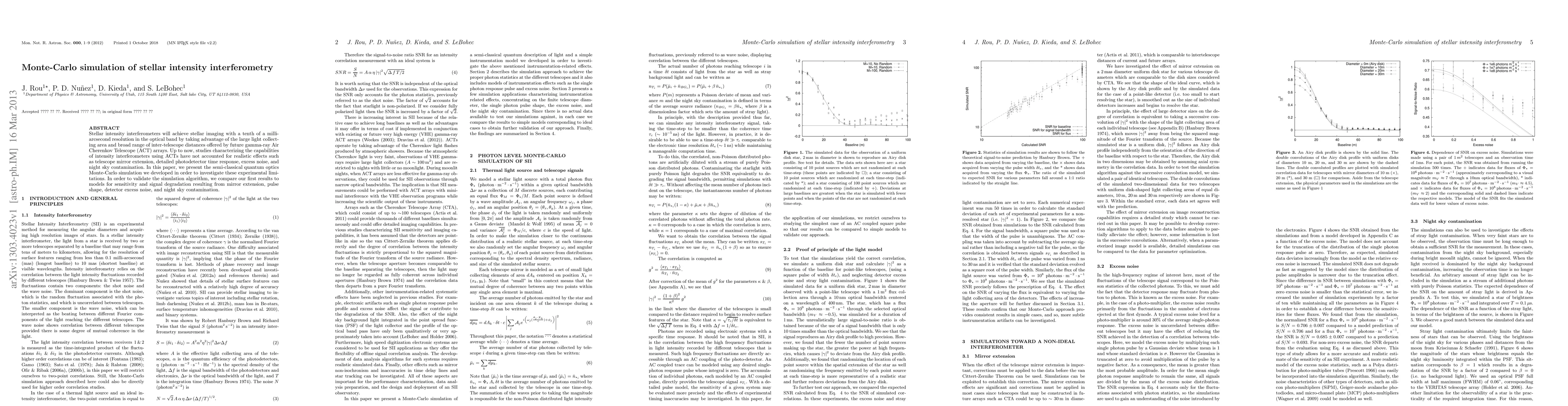 Stellar intensity interferometers will achieve stellar imaging with a tenth of a milli- arcsecond resolution in the optical band by taking advantage of the large light collect- ing area and broad range of inter-telescope distances offered by future gamma-ray Air Cherenkov Telescope (ACT) arrays. Up to now, studies characterizing the capabilities of intensity interferometers using ACTs have not accounted for realistic effects such as telescope mirror extension, detailed photodetector time response, excess noise, and night sky contamination. In this paper, we present the semi-classical quantum optics Monte-Carlo simulation we developed in order to investigate these experimental limi- tations. In order to validate the simulation algorithm, we compare our first results to models for sensitivity and signal degradation resulting from mirror extension, pulse shape, detector excess noise, and night sky contamination.