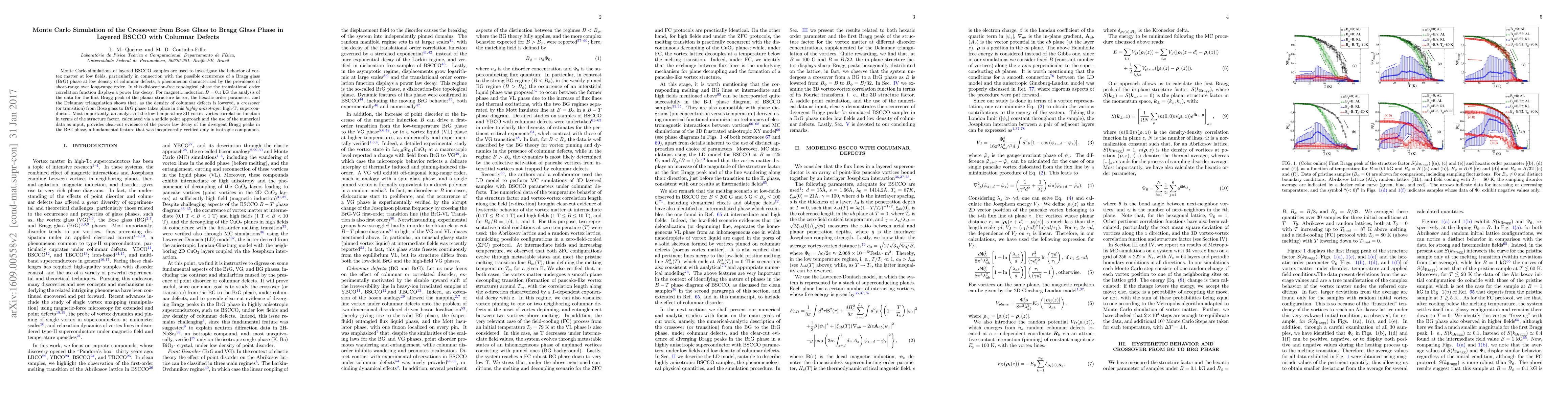 Monte Carlo simulations reveal a crossover from Bose glass to Bragg glass phase in layered BSCCO with columnar defects, characterized by short-range order dominance. The analysis confirms the power law decay of Bragg peaks in the Bragg glass phase, a feature previously observed only in isotropic compounds.