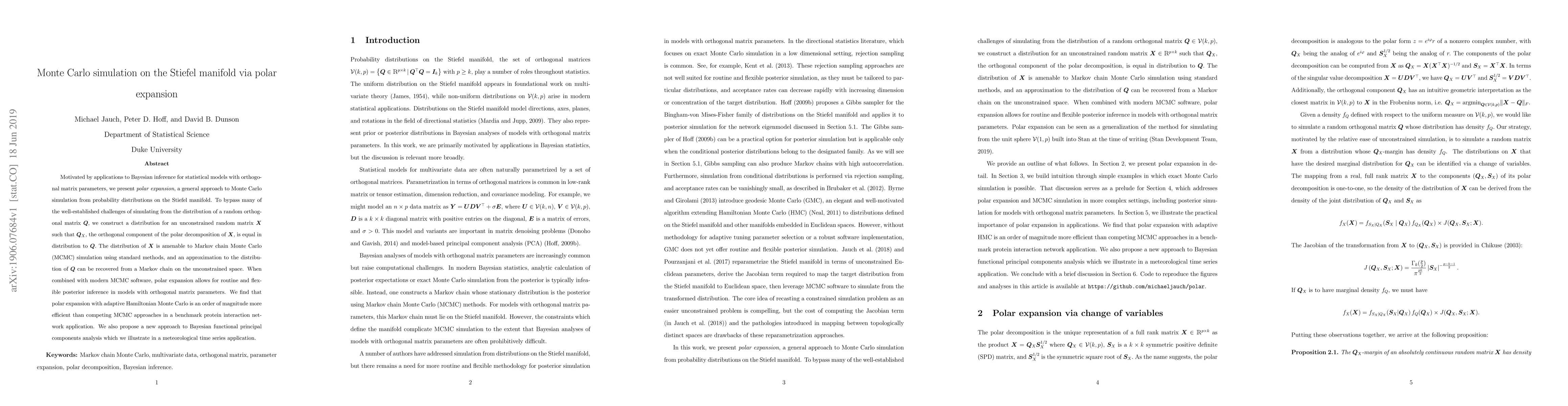 This paper introduces polar expansion, a novel Monte Carlo simulation method for probability distributions on the Stiefel manifold, facilitating Bayesian inference for statistical models with orthogonal matrix parameters. The method constructs an unconstrained matrix distribution that allows efficient Markov chain Monte Carlo simulation, demonstrating significant efficiency gains in applications like protein interaction networks and Bayesian functional principal components analysis.