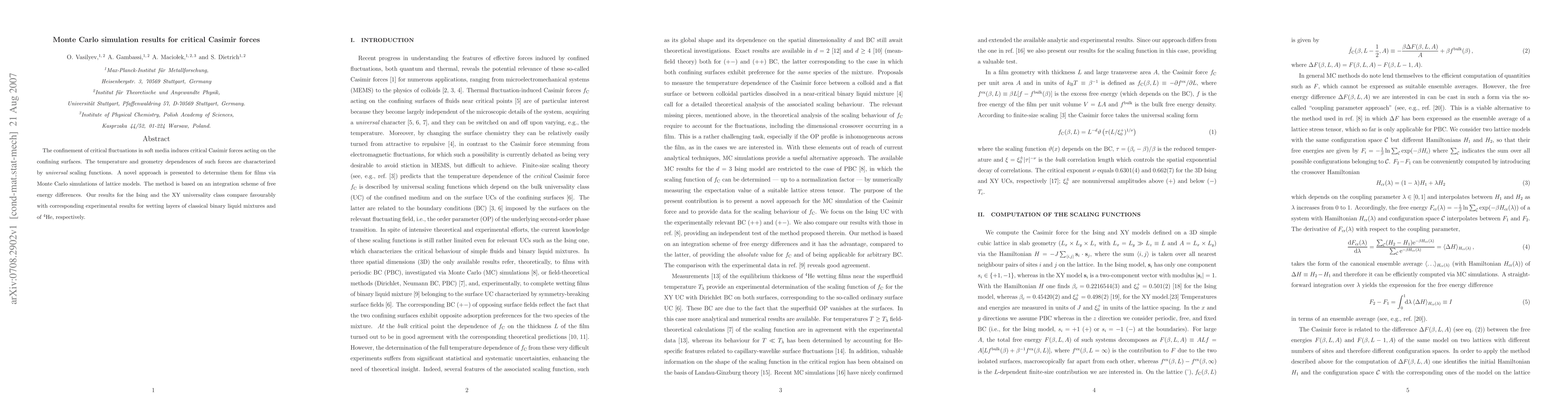 This paper presents a novel Monte Carlo simulation method to determine the critical Casimir forces in confined systems, showing good agreement with experimental results for wetting layers in binary liquid mixtures and 4He. The approach uses an integration scheme of free energy differences to characterize the temperature and geometry dependences of these forces.