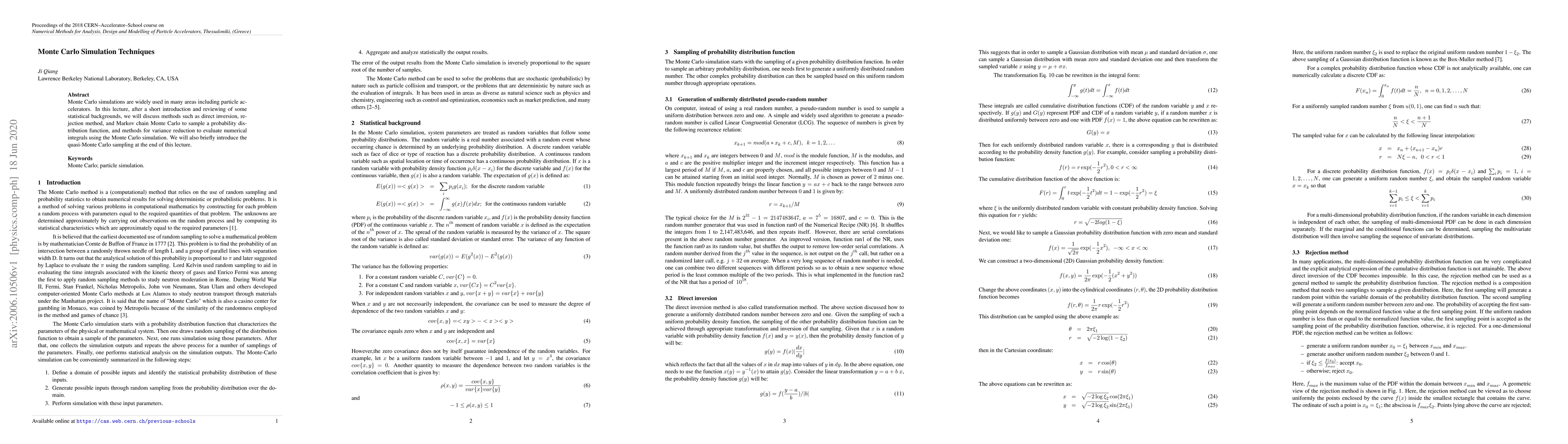 Monte Carlo simulations are widely used in many areas including particle accelerators. In this lecture, after a short introduction and reviewing of some statistical backgrounds, we will discuss methods such as direct inversion, rejection method, and Markov chain Monte Carlo to sample a probability distribution function, and methods for variance reduction to evaluate numerical integrals using the Monte Carlo simulation. We will also briefly introduce the quasi-Monte Carlo sampling at the end of this lecture.