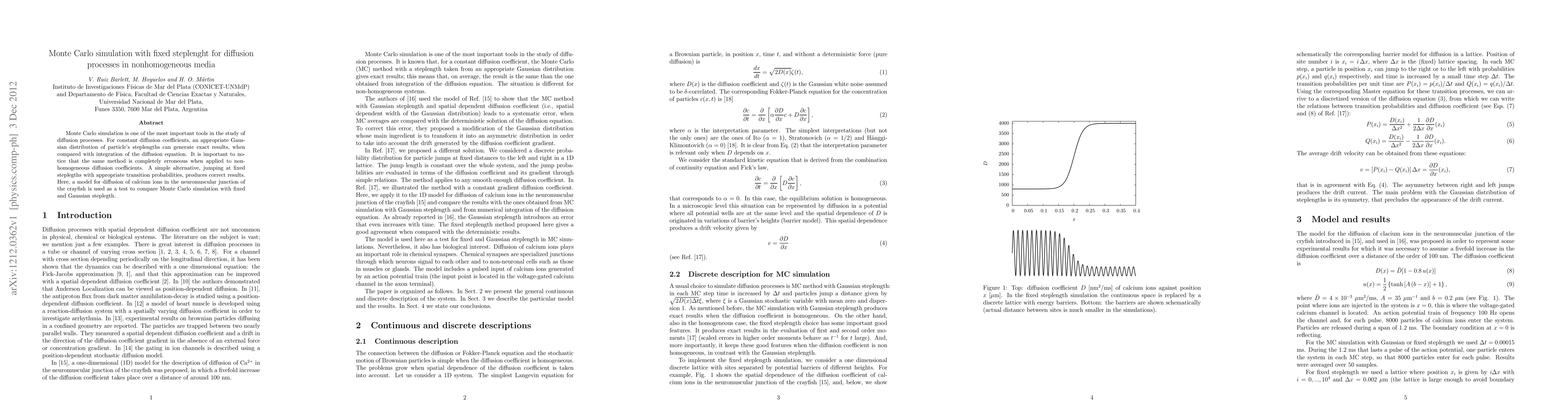 Monte Carlo simulation is one of the most important tools in the study of diffusion processes. For constant diffusion coefficients, an appropriate Gaussian distribution of particle's steplengths can generate exact results, when compared with integration of the diffusion equation. It is important to notice that the same method is completely erroneous when applied to non-homogeneous diffusion coefficients. A simple alternative, jumping at fixed steplegths with appropriate transition probabilities, produces correct results. Here, a model for diffusion of calcium ions in the neuromuscular junction of the crayfish is used as a test to compare Monte Carlo simulation with fixed and Gaussian steplegth.