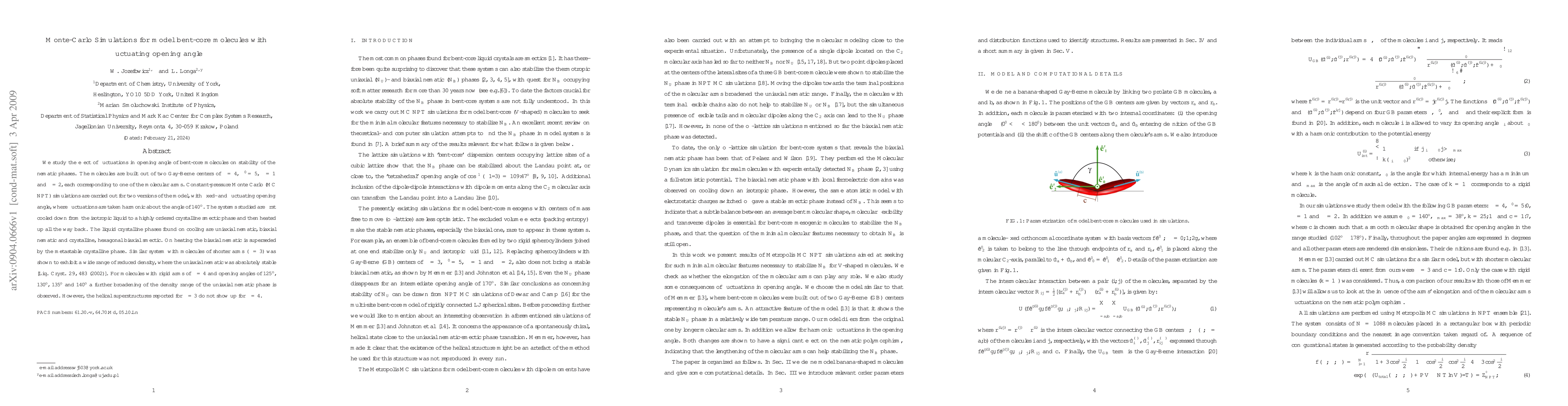 This study uses Monte Carlo simulations to examine how fluctuations in the opening angle of bent-core molecules impact the stability of nematic phases. With fixed- and fluctuating opening angles, the research identifies various liquid crystalline phases formed during cooling (uniaxial nematic, biaxial nematic, crystalline, hexagonal biaxial smectic) and heating (biaxial nematic turning into a metastable crystalline phase). Comparing with shorter-armed molecules, the research finds that longer, rigid arms broaden the density range of the uniaxial nematic phase, but do not exhibit helical superstructures.