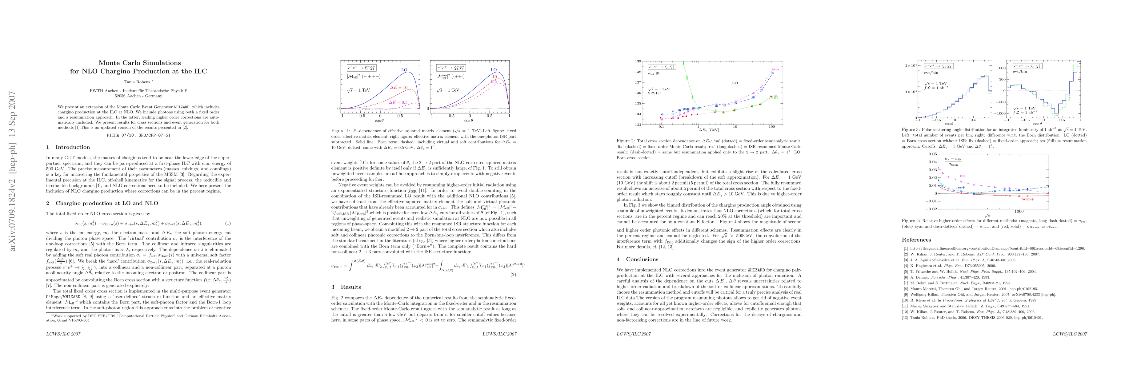 We present an extension of the Monte Carlo Event Generator Whizard which includes chargino production at the ILC at NLO. We include photons using both a fixed order and a resummation approach. In the latter, leading higher order corrections are automatically included. We present results for cross sections and event generation for both methods.