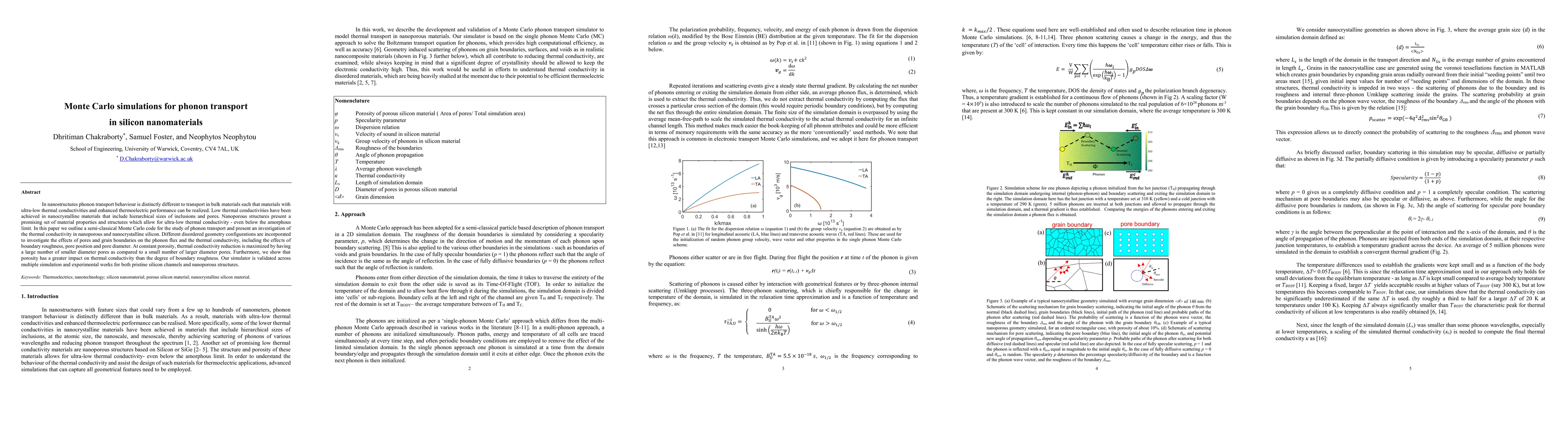 This paper presents a Monte Carlo simulation for phonon transport in silicon nanomaterials, focusing on nanoporous and nanocrystalline structures. The study reveals that smaller diameter pores maximize thermal conductivity reduction, with porosity having a greater impact than boundary roughness.