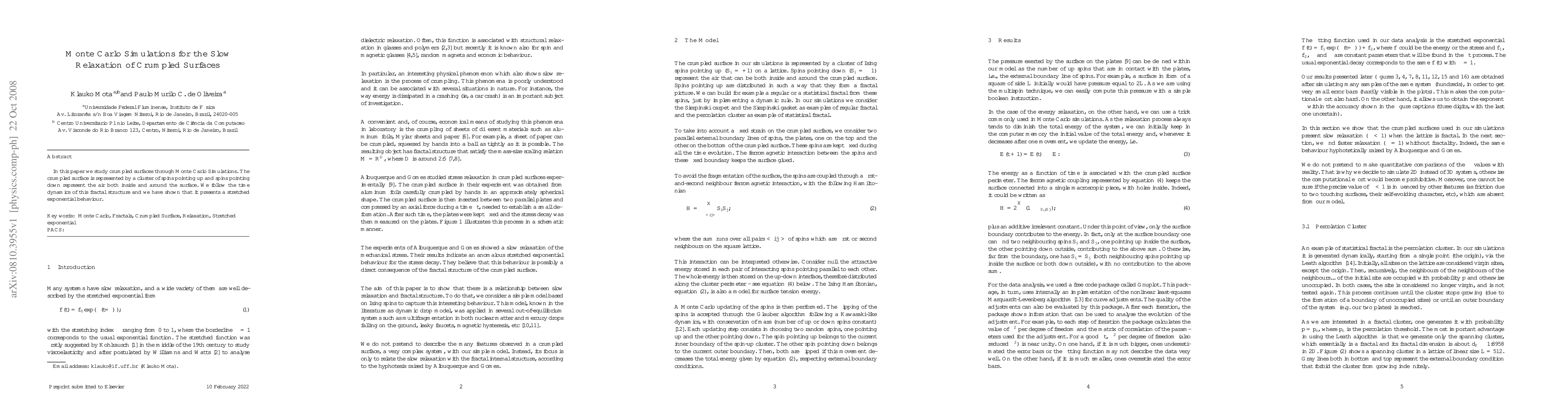 In this paper we study crumpled surfaces through Monte Carlo Simulations. The crumpled surface is represented by a cluster of spins pointing up and spins pointing down represent the air both inside and around the surface. We follow the time dynamics of this fractal structure and we have shown that it presents a stretched exponential behaviour.