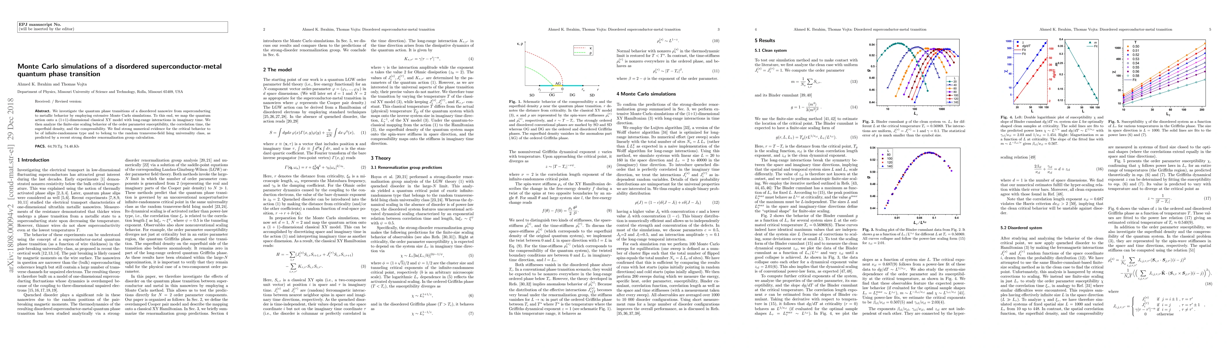 This paper uses Monte Carlo simulations to study the quantum phase transition in a disordered nanowire transitioning from superconducting to metallic states. The findings indicate critical behavior of infinite-randomness type, aligning with predictions from strong disorder renormalization group calculations and the random transverse-field Ising universality class.