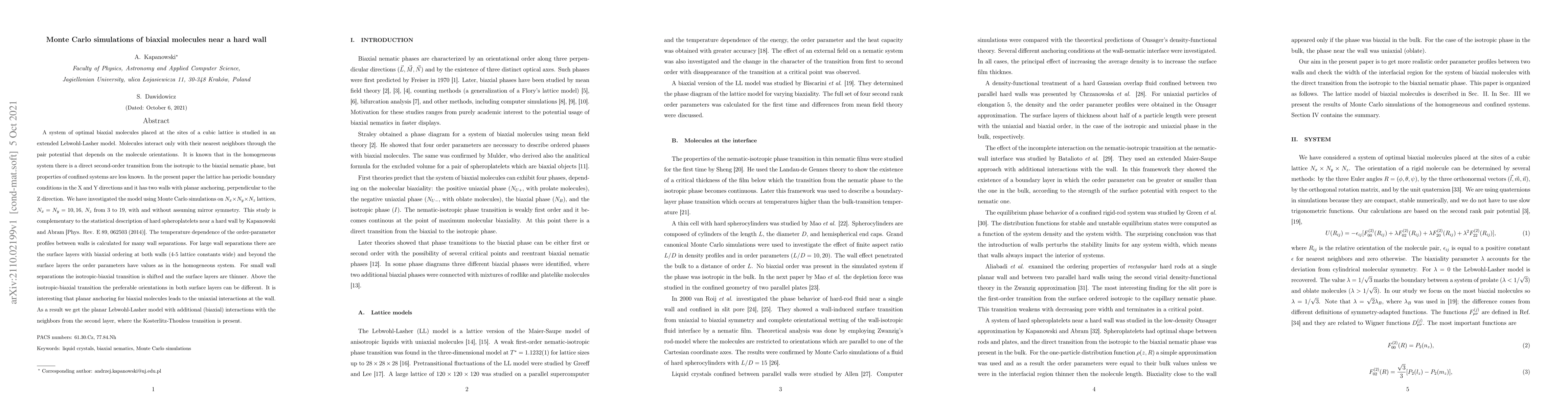 A system of optimal biaxial molecules placed at the sites of a cubic lattice is studied in an extended Lebwohl-Lasher model. Molecules interact only with their nearest neighbors through the pair potential that depends on the molecule orientations. It is known that in the homogeneous system there is a direct second-order transition from the isotropic to the biaxial nematic phase, but properties of confined systems are less known. In the present paper the lattice has periodic boundary conditions in the X and Y directions and it has two walls with planar anchoring, perpendicular to the Z direction. We have investigated the model using Monte Carlo simulations on $N_x \times N_y \times N_z$ lattices, $N_x = N_y = 10, 16$, $N_z$ from 3 to 19, with and without assuming mirror symmetry. This study is complementary to the statistical description of hard spheroplatelets near a hard wall by Kapanowski and Abram [Phys. Rev. E 89, 062503 (2014)]. The temperature dependence of the order-parameter profiles between walls is calculated for many wall separations. For large wall separations there are the surface layers with biaxial ordering at both walls (4-5 lattice constants wide) and beyond the surface layers the order parameters have values as in the homogeneous system. For small wall separations the isotropic-biaxial transition is shifted and the surface layers are thinner. Above the isotropic-biaxial transition the preferable orientations in both surface layers can be different. It is interesting that planar anchoring for biaxial molecules leads to the uniaxial interactions at the wall. As a result we get the planar Lebwohl-Lasher model with additional (biaxial) interactions with the neighbors from the second layer, where the Kosterlitz-Thouless transition is present.