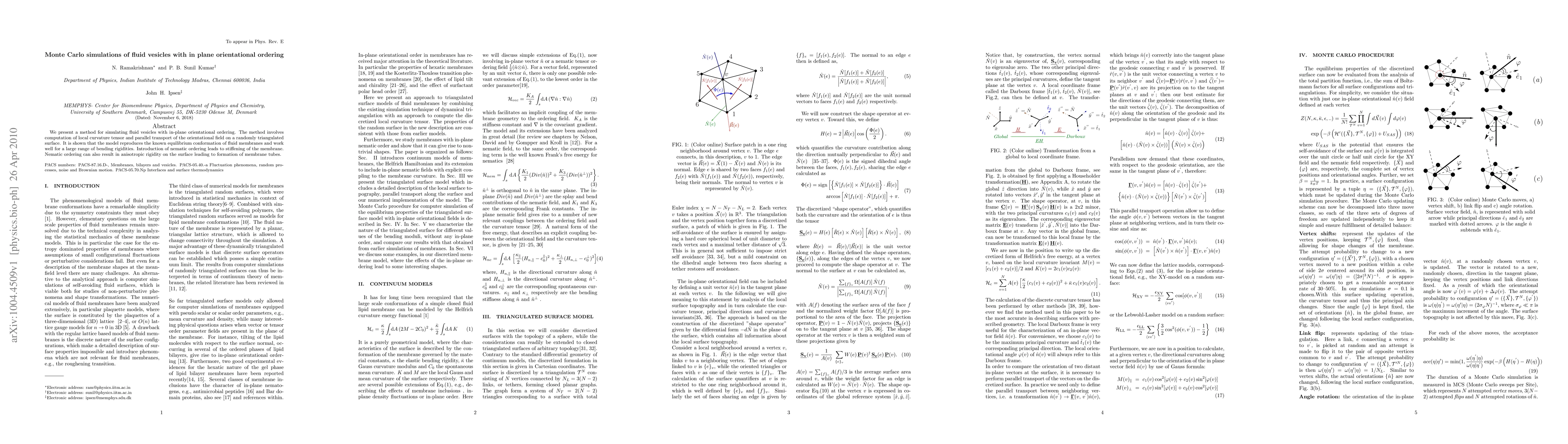 We present a method for simulating fluid vesicles with in-plane orientational ordering. The method involves computation of local curvature tensor and parallel transport of the orientational field on a randomly triangulated surface. It is shown that the model reproduces the known equilibrium conformation of fluid membranes and work well for a large range of bending rigidities. Introduction of nematic ordering leads to stiffening of the membrane. Nematic ordering can also result in anisotropic rigidity on the surface leading to formation of membrane tubes.