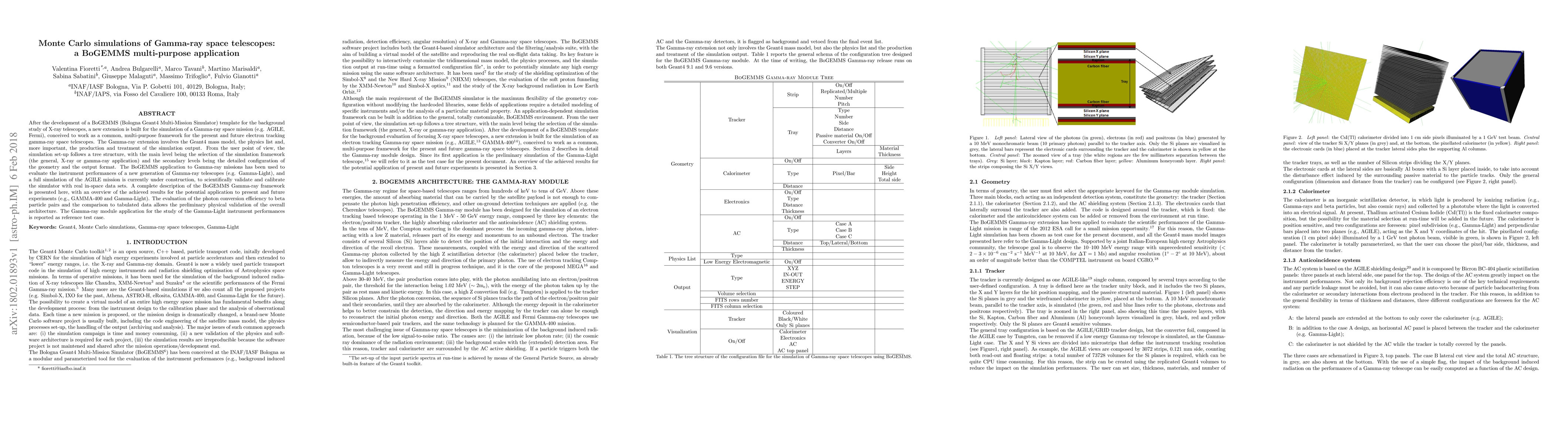 After the development of a BoGEMMS (Bologna Geant4 Multi-Mission Simulator) template for the back- ground study of X-ray telescopes, a new extension is built for the simulation of a Gamma-ray space mission (e.g. AGILE, Fermi), conceived to work as a common, multi-purpose framework for the present and future electron tracking gamma-ray space telescopes. The Gamma-ray extension involves the Geant4 mass model, the physics list and, more important, the production and treatment of the simulation output. From the user point of view, the simulation set-up follows a tree structure, with the main level being the selection of the simulation framework (the general, X-ray or gamma-ray application) and the secondary levels being the detailed configuration of the geometry and the output format. The BoGEMMS application to Gamma-ray missions has been used to evaluate the instrument performances of a new generation of Gamma-ray tele- scopes (e.g. Gamma-Light), and a full simulation of the AGILE mission is currently under construction, to scientifically validate and calibrate the simulator with real in-space data sets. A complete description of the BoGEMMS Gamma-ray framework is presented here, with an overview of the achieved results for the potential application to present and future experiments (e.g., GAMMA-400 and Gamma-Light). The evaluation of the photon conversion efficiency to beta particle pairs and the comparison to tabulated data allows the preliminary physical validation of the overall architecture. The Gamma-ray module application for the study of the Gamma-Light instrument performances is reported as reference test case.
