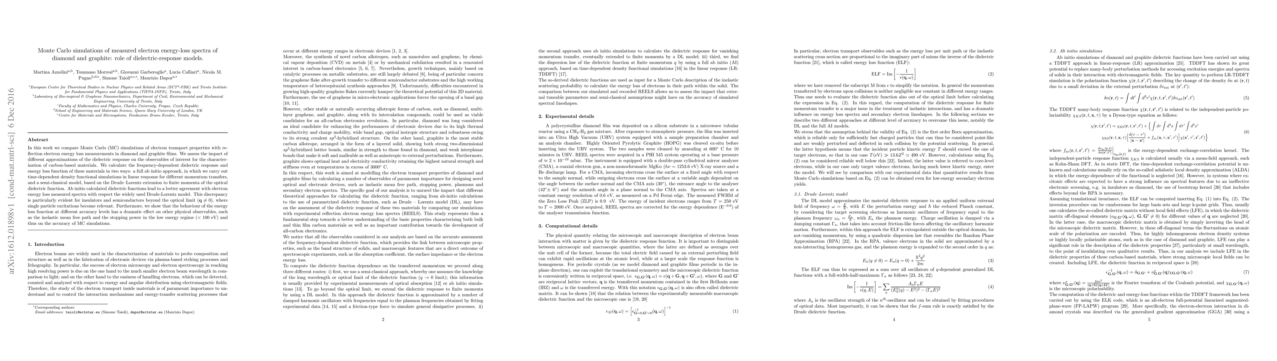 This paper compares Monte Carlo simulations of electron transport in diamond and graphite with measured electron energy loss spectra, highlighting the impact of different dielectric-response models. Ab initio calculations yield better agreement with experimental data than the semi-classical Drude-Lorentz model, especially for non-optical momentum transfers, affecting material characterization and simulation accuracy in low energy regimes.