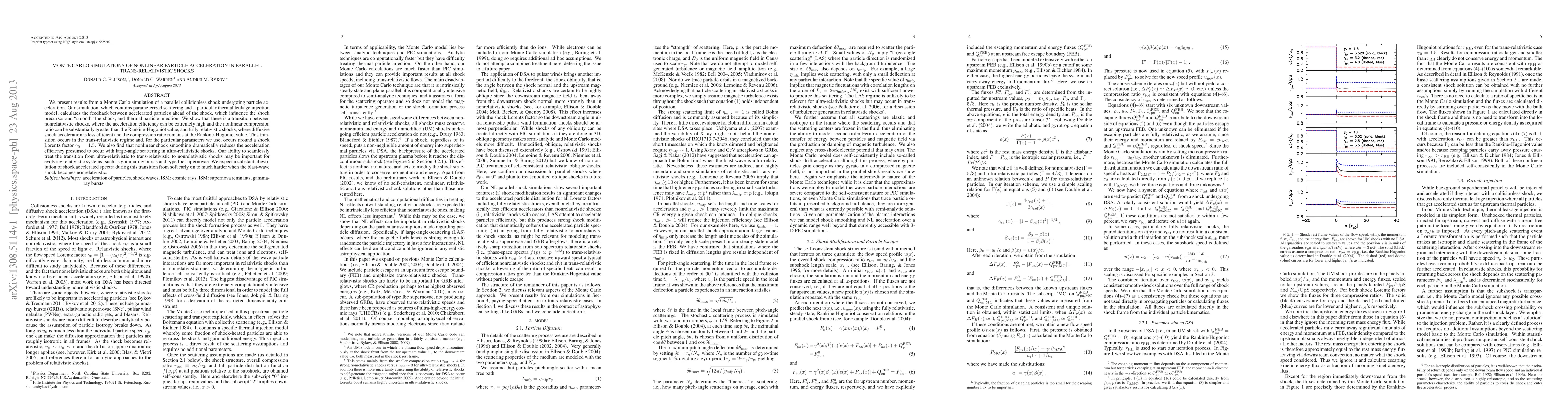 We present results from a Monte Carlo simulation of a parallel collisionless shock undergoing particle acceleration. Our simulation, which contains parameterized scattering and a particular thermal leakage injection model, calculates the feedback between accelerated particles ahead of the shock, which influence the shock precursor and "smooth" the shock, and thermal particle injection. We show that there is a transition between nonrelativistic shocks, where the acceleration efficiency can be extremely high and the nonlinear compression ratio can be substantially greater than the Rankine-Hugoniot value, and fully relativistic shocks, where diffusive shock acceleration is less efficient and the compression ratio remains at the Rankine-Hugoniot value. This transition occurs in the trans-relativistic regime and, for the particular parameters we use, occurs around a shock Lorentz factor = 1.5. We also find that nonlinear shock smoothing dramatically reduces the acceleration efficiency presumed to occur with large-angle scattering in ultra-relativistic shocks. Our ability to seamlessly treat the transition from ultra-relativistic to trans-relativistic to nonrelativistic shocks may be important for evolving relativistic systems, such as gamma-ray bursts and type Ibc supernovae. We expect a substantial evolution of shock accelerated spectra during this transition from soft early on to much harder when the blast-wave shock becomes nonrelativistic.