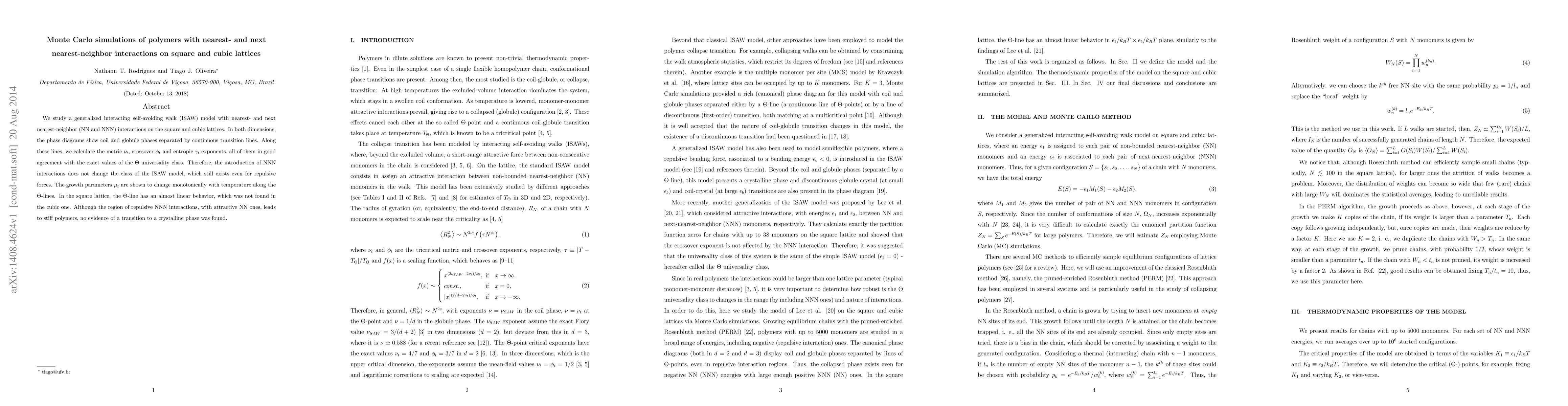 We study a generalized interacting self-avoiding walk (ISAW) model with nearest- and next nearest-neighbor (NN and NNN) interactions on the square and cubic lattices. In both dimensions, the phase diagrams show coil and globule phases separated by continuous transition lines. Along these lines, we calculate the metric $\nu_t$, crossover $\phi_t$ and entropic $\gamma_t$ exponents, all of them in good agreement with the exact values of the $\Theta$ universality class. Therefore, the introduction of NNN interactions does not change the class of the ISAW model, which still exists even for repulsive forces. The growth parameters $\mu_t$ are shown to change monotonically with temperature along the $\Theta$-lines. In the square lattice, the $\Theta$-line has an almost linear behavior, which was not found in the cubic one. Although the region of repulsive NNN interactions, with attractive NN ones, leads to stiff polymers, no evidence of a transition to a crystalline phase was found.
