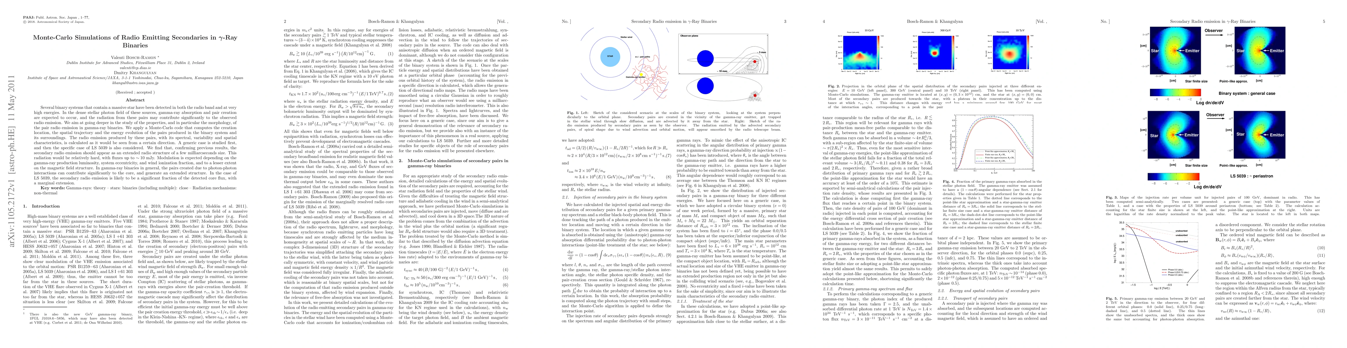 This paper uses Monte-Carlo simulations to study the radio emission from gamma-ray binaries, focusing on the secondary radio emission from pairs created by gamma-ray absorption. The simulations show that this secondary emission forms an extended structure, modulated by factors like gamma-ray luminosity and system eccentricity, and is significant in systems like LS 5039.