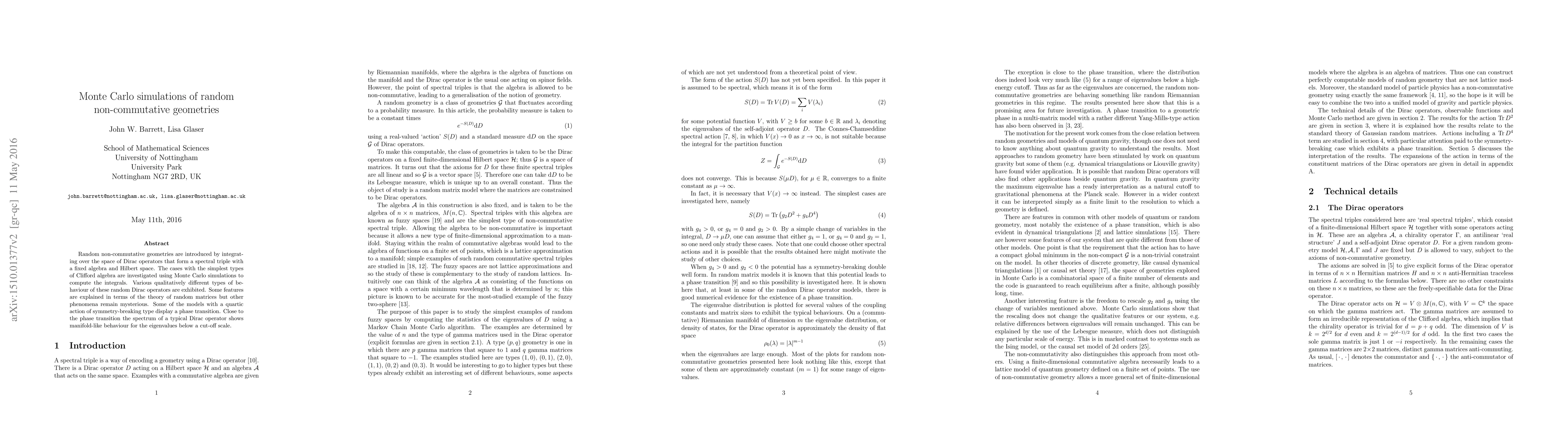 Monte Carlo simulations explore random non-commutative geometries formed by integrating over Dirac operators, revealing diverse behaviors and phase transitions, with some phenomena linked to random matrix theory. Near phase transitions, the Dirac operator's spectrum exhibits manifold-like eigenvalue distributions.