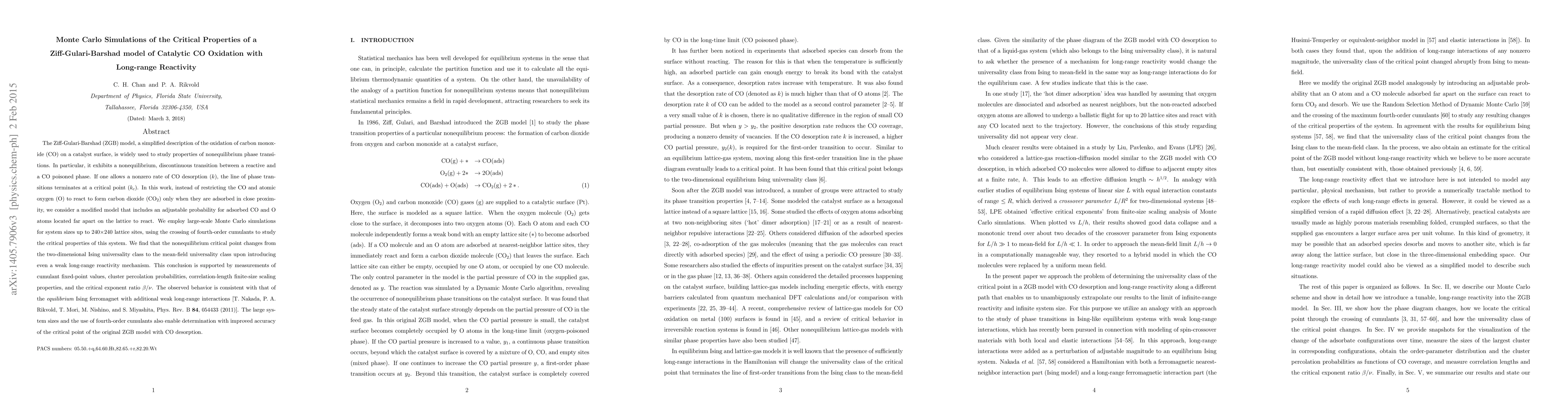 This paper investigates the critical properties of a modified Ziff-Gulari-Barshad model for catalytic CO oxidation, incorporating long-range reactivity. Monte Carlo simulations reveal a shift from the Ising to mean-field universality class due to this long-range effect, supported by various critical measurements.