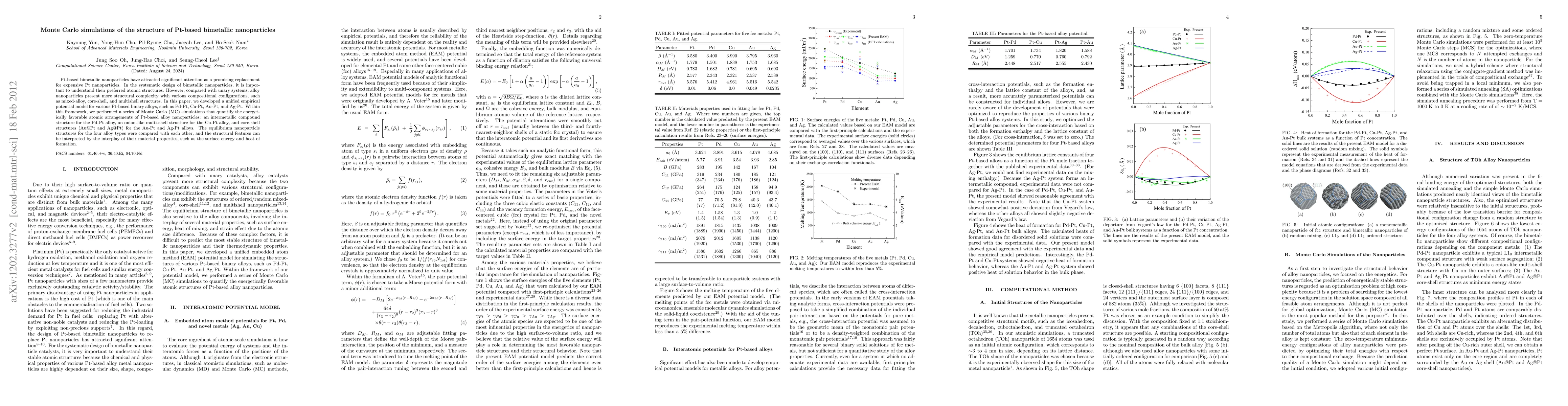 This paper develops an empirical potential model to simulate Pt-based bimetallic nanoparticles, revealing preferred atomic structures like intermetallic compounds, onion-like multi-shells, and core-shell arrangements, which are influenced by material properties such as surface energy and heat of formation.