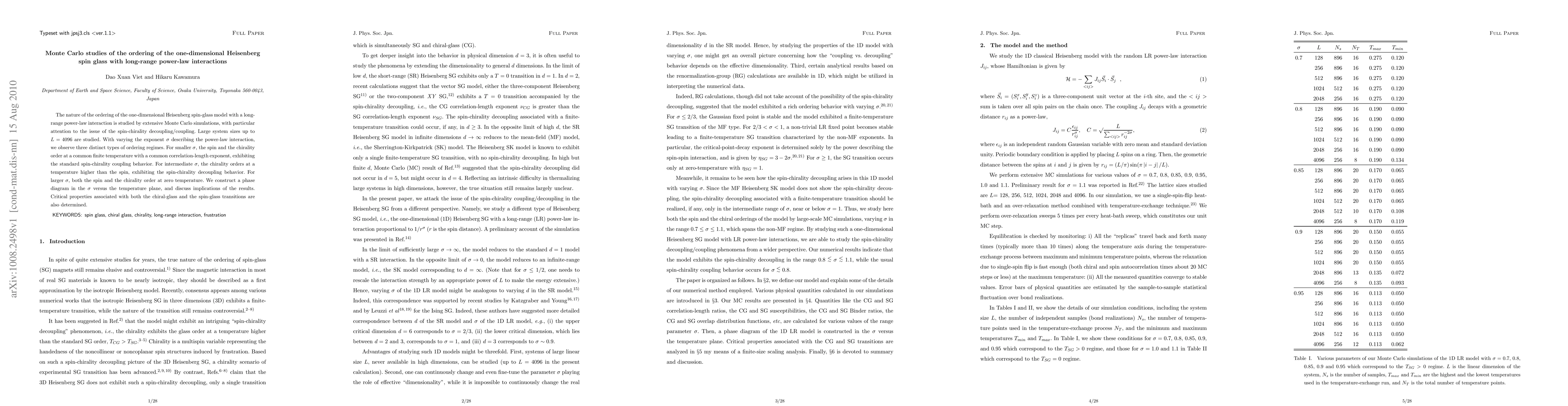 This paper uses Monte Carlo simulations to study the ordering behavior in a one-dimensional Heisenberg spin-glass model with long-range power-law interactions, identifying three distinct ordering regimes based on the interaction exponent $\sigma$. The findings reveal spin-chirality coupling, decoupling, and independent ordering at zero temperature.