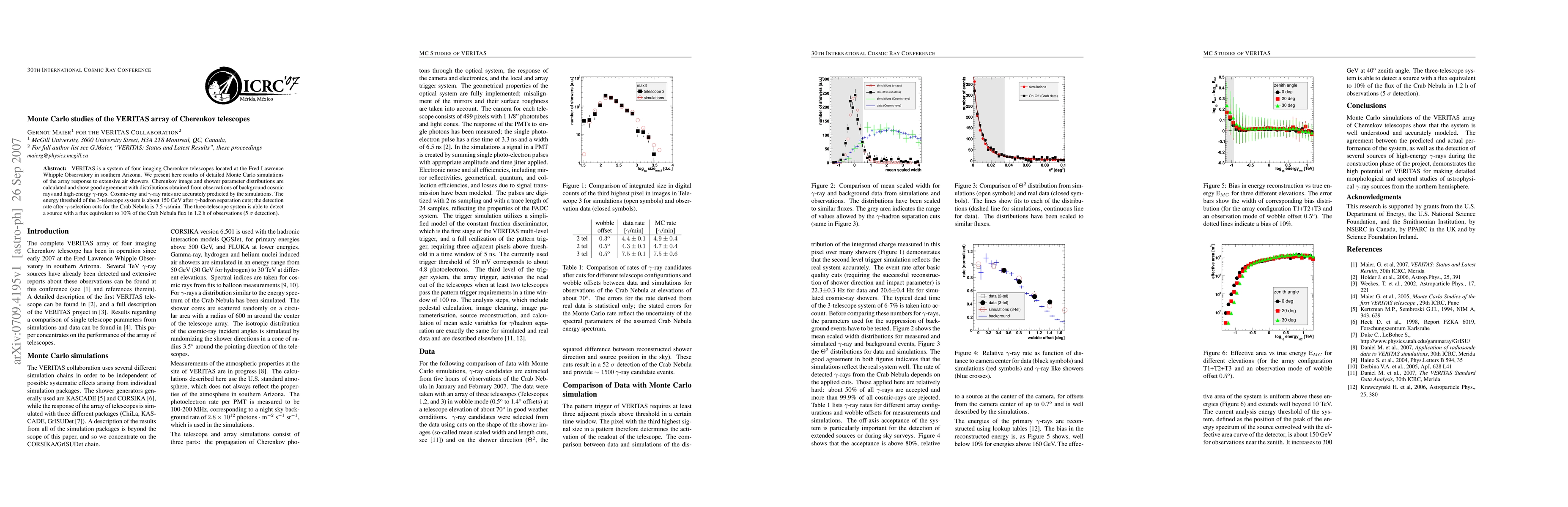 This paper details Monte Carlo simulations of the VERITAS array of Cherenkov telescopes, showing good agreement between simulated and observed distributions of cosmic rays and gamma-rays. The system can detect gamma-ray sources with a flux of 10% of the Crab Nebula in 1.2 hours with a 5-sigma confidence level.