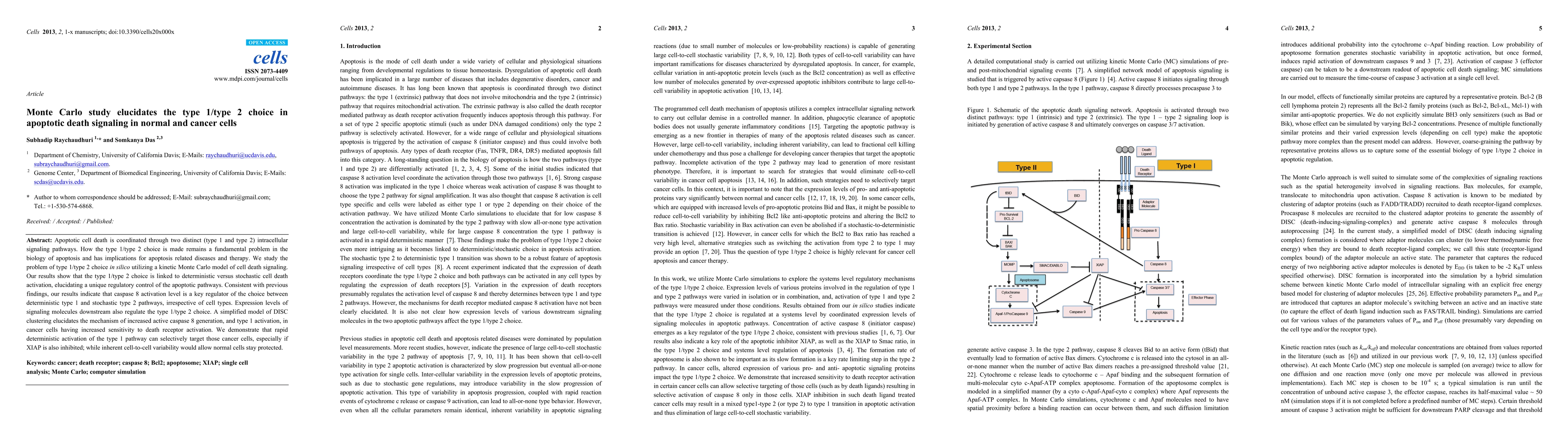 This Monte Carlo study investigates the choice between type 1 and type 2 apoptotic signaling pathways in normal and cancer cells, revealing that caspase 8 activation levels determine the pathway choice, with rapid deterministic activation favoring type 1 in cancer cells, potentially offering a therapeutic advantage.