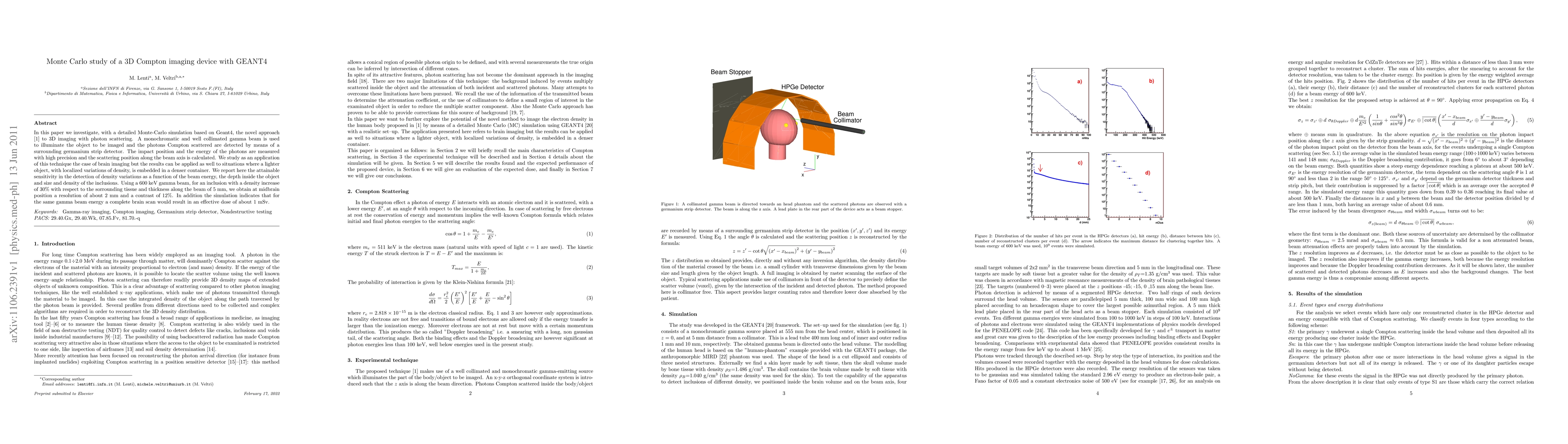 Researchers used a Monte Carlo simulation to study a 3D Compton imaging device for brain imaging, finding a resolution of about 2mm and contrast of 12% with a 600 keV gamma beam, and estimated an effective dose of 1 mSv for a complete brain scan.